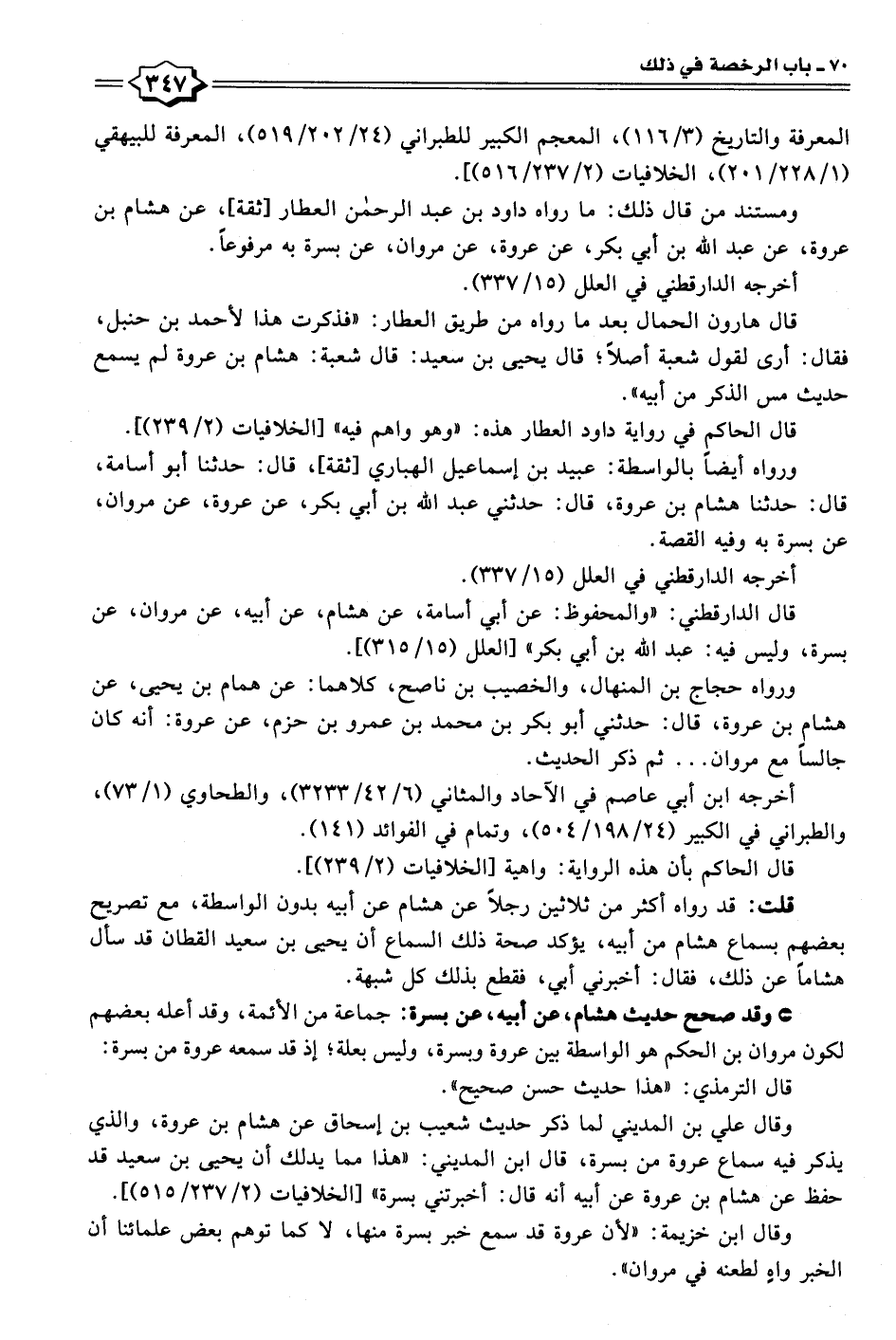 • وقد سمع حديث هثام، عن أببه، عن بسرة: جماعة من الأئمة، وقد أعله بعضهم لكون مروان بن الحكم هو الواسطة بين عروة وبسرة، وليس بعلة؛ إذ قد سمعه عروة من بسرة: