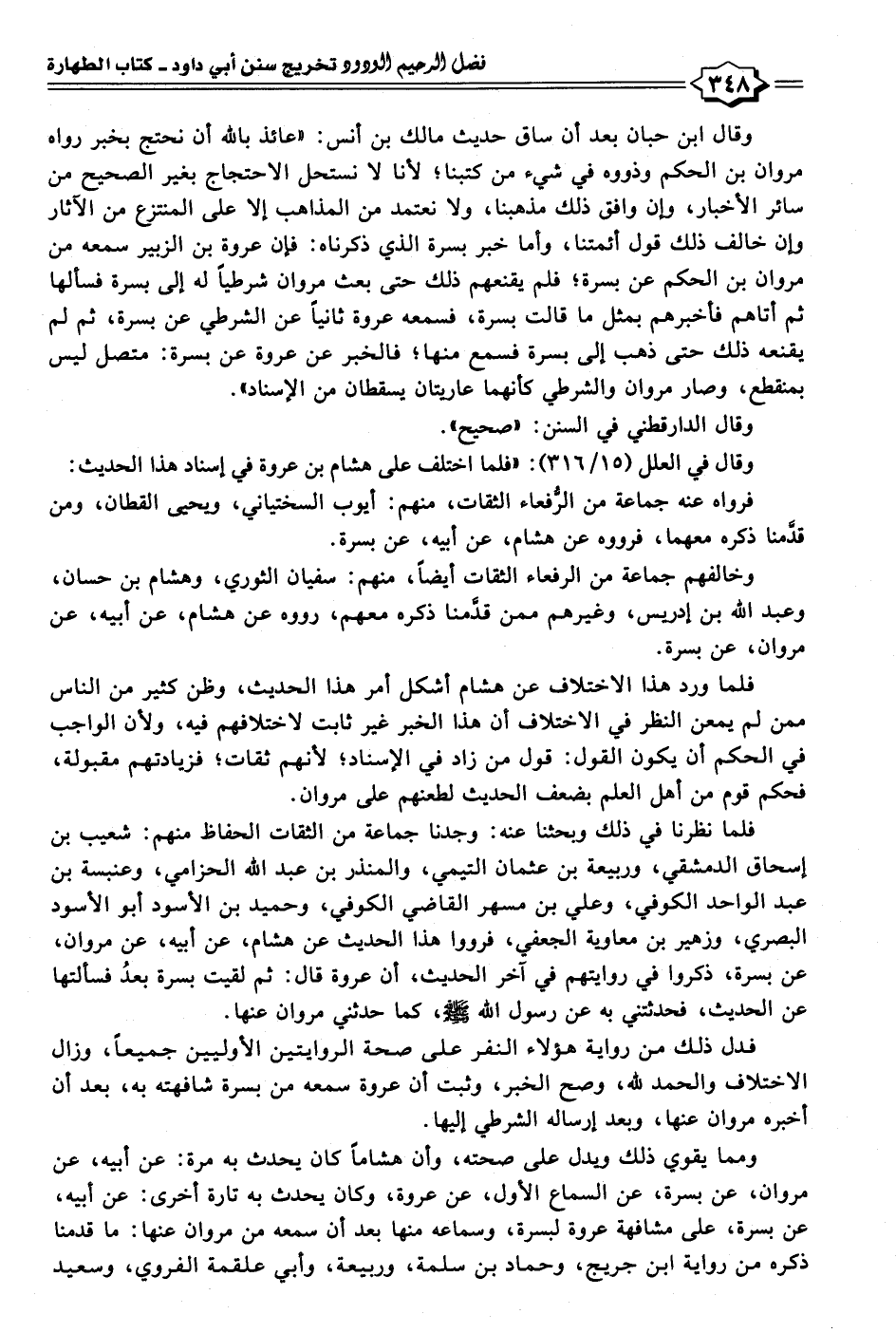 فلما نظرنا في ذلك وبحثنا عنه: وجدنا جماعة من الثقات الحفاظ منهم: شعيب بن إسحاق الدمشقي، وربيعة بن عثمان التيمي، والمنذر بن عبد الله الحزامي، وعنبسة بن عبد الواحد الكوفي، وعلي بن مسهر القاضي الكوفي، وحميد بن الأسود أبو الأسود البصري، وزهير بن معاوية الجعفي، فرووا هذا الحديث عن هشام، عن أبيه، عن مروان، عن بسرة، ذكروا في روايتهم في آخر الحديث، أن عروة قال: ثم لقيت بسرة بعدُ فسالتها عن الحديث، فحدثتني به عن رسول الله - صلى الله عليه وسلم -، كما حدثني مروان عنها.