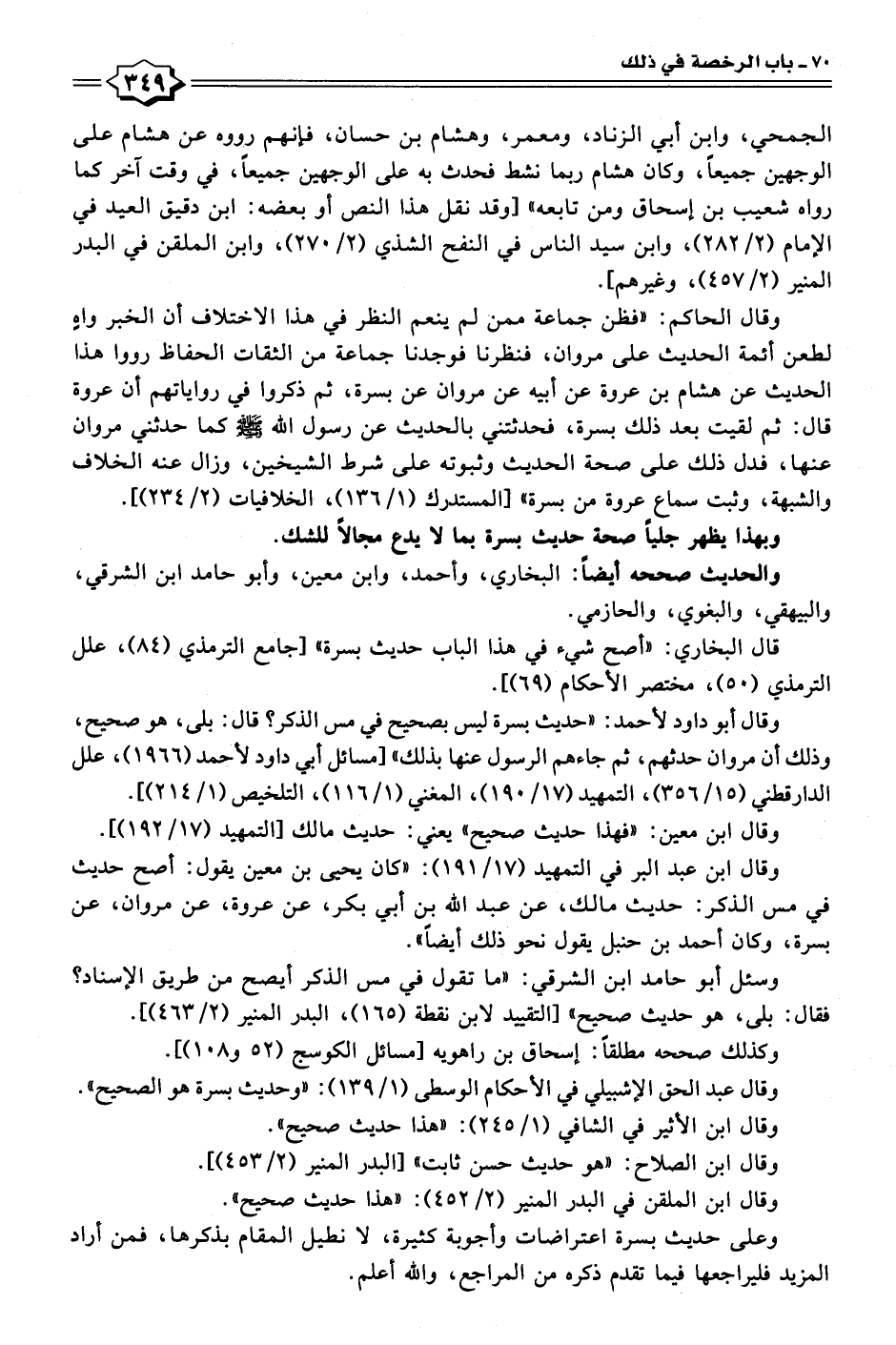 وقال الحاكم: "فظن جماعة ممن لم ينعم النظر في هذا الاختلاف أن الخبر واهٍ لطعن أئمة الحديث على مروان، فنظرنا فوجدنا جماعة من الثقات الحفاظ رووا هذا الحديث عن هشام بن عروة عن أبيه عن مروان عن بسرة، ثم ذكروا في رواياتهم أن عروة قال: ثم لقيت بعد ذلك بسرة، فحدثتني بالحديث عن رسول الله - صلى الله عليه وسلم - كما حدثني مروان عنها، فدل ذلك على صحة الحديث وثبوته على شرط الشيخين، وزال عنه الخلاف والشبهة، وثبت سماع عروة من بسرة" [المستدرك (١/ ١٣٦)، الخلافيات (٢/ ٢٣٤)].