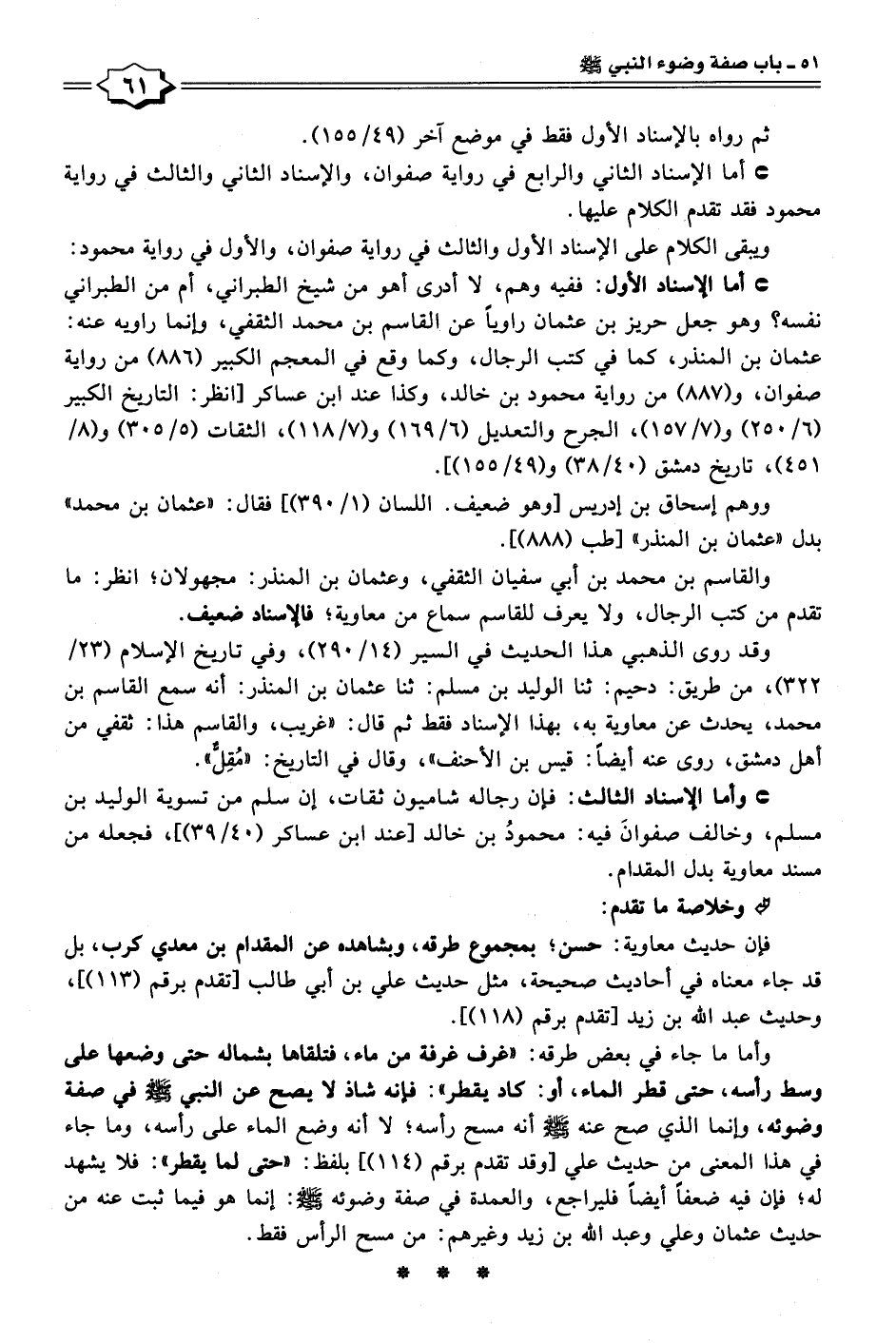 وأما ما جاء في بعض طرقه: "غرف غرفة من ماء، فتلقاها بشماله حتى وضعها على وسط رأسه، حتى قطر الماء، أو: كاد يقطر": فإنه شاذ لا يصح عن النبي - صلى الله عليه وسلم - في صفة وضوئه، وإنما الذي صح عنه - صلى الله عليه وسلم - أنه مسح رأسه؛ لا أنه وضع الماء على رأسه، وما جاء في هذا المعنى من حديث علي [وقد تقدم برقم (١١٤)] بلفظ: "حتى لما يقطر": فلا يشهد له؛ فإن فيه ضعفًا أيضًا فليراجع، والعمدة في صفة وضوئه - صلى الله عليه وسلم -: إنما هو فيما ثبت عنه من حديث عثمان وعلي وعبد الله بن زيد وغيرهم: من مسح الرأس فقط.