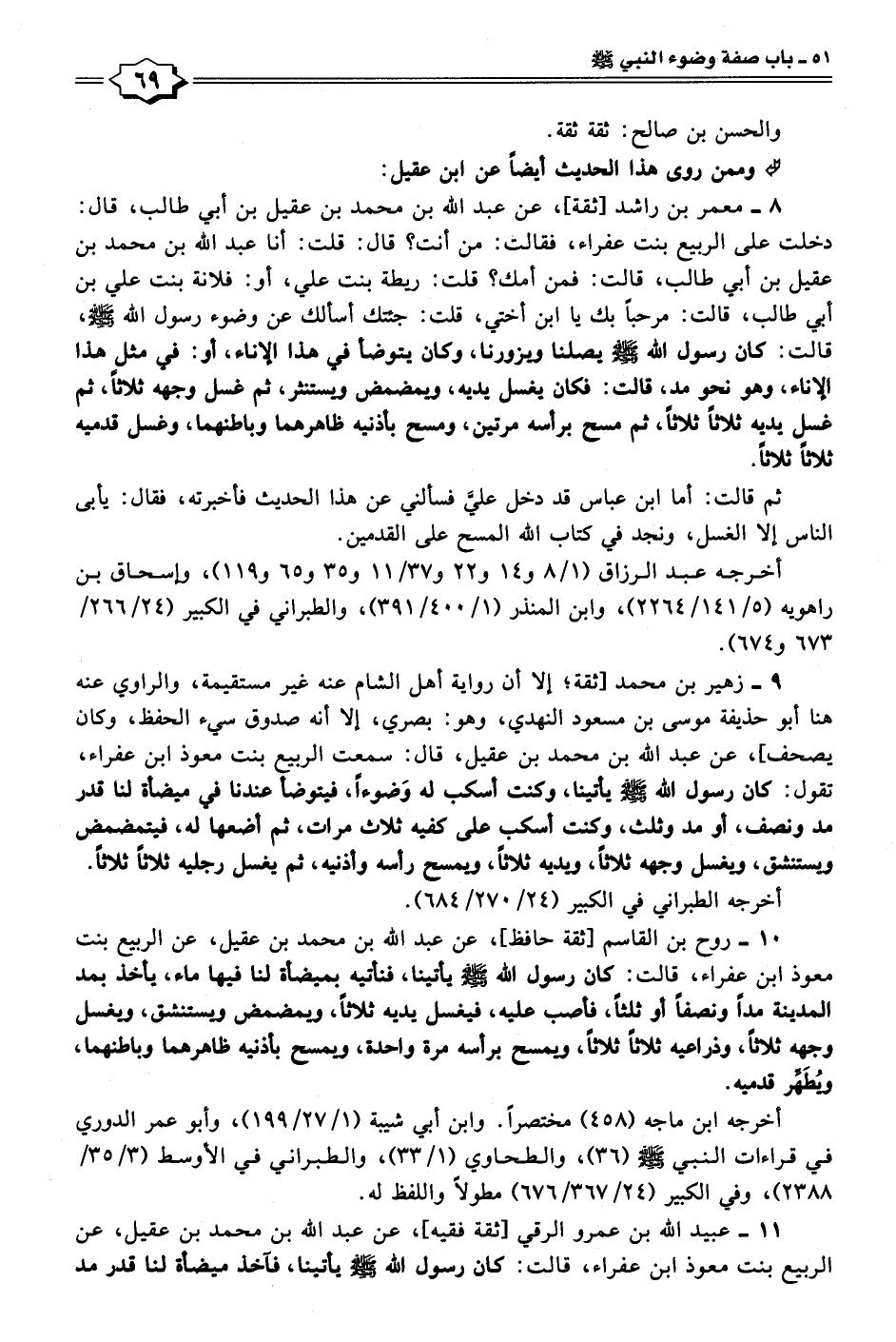 ٨ - معمر بن راشد [ثقة]، عن عبد الله بن محمد بن عقيل بن أبي طالب، قال: دخلت على الربيع بنت عفراء، فقالت: من أنت؟ قال: قلت: أنا عبد الله بن محمد بن عقيل بن أبي طالب، قالت: فمن أمك؟ قلت: ريطة بنت علي، أو: فلانة بنت علي بن أبي طالب، قالت: مرحبًا بك يا ابن أختي، قلت: جئتك أسألك عن وضوء رسول الله - صلى الله عليه وسلم -، قالت: كان رسول الله - صلى الله عليه وسلم - يصلنا ويزورنا، وكان يتوضأ في هذا الإناء، أو: في مثل هذا الإناء، وهو نحو مد، قالت: فكان يغسل يديه، ويمضمض ويستنثر، ثم غسل وجهه ثلاثًا، ثم غسل يديه ثلاثًا ثلاثًا، ثم مسح برأسه مرتين، ومسح بأذنيه ظاهرهما وباطنهما، وغسل قدميه ثلاثًا ثلاثًا.