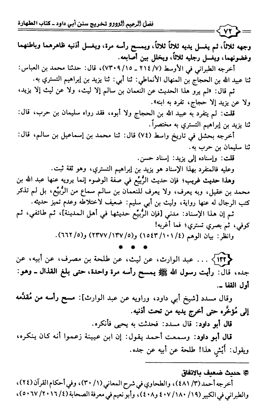 ١٣٢ - . . . عبد الوارث، عن ليث، عن طلحة بن مصرف، عن أبيه، عن جده، قال: رأيت رسول الله - صلى الله عليه وسلم - يمسح رأسه مرة واحدة، حتى بلغ القذال -وهو: أول القفا-.