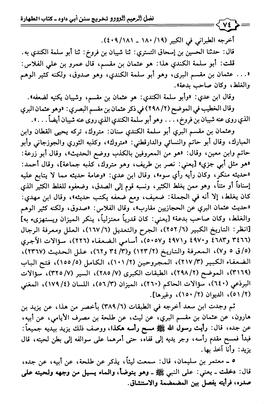 ثم وجدت ابن سعد أخرجه في الطبقات (٦/ ٣٨٩) بأخصر من هذا، عن يزيد بن هارون، عن عثمان بن مقسم البري، عن ليث، عن طلحة بن مصرف الأيامي، عن أبيه، عن جده، قال: رأيت رسول الله - صلى الله عليه وسلم - مسح رأسه هكذا، ووصف ذلك يزيد بيديه جميعًا: فبدأ فمسح مقدم رأسه، وجر يديه إلى قفاه، حتى أمرهما على سوالفه إلى بطن لحيته، قال يزيد: وأنا آخذ بها.