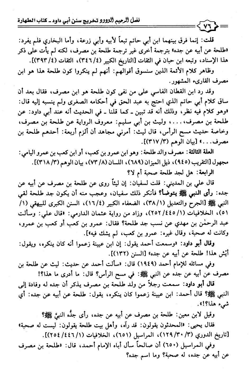 وقد رد ابن القطان الفاسي على من نفى كون طلحة هو ابن مصرف، فقال بعد أن ساق كلام أبي حاتم الذي احتج به عبد الحق في أحكامه الصغرى ولم ينسبه إليه قال: "وهو كلام فيه نظر، وذلك أنه قد تبين -كما قلنا- في الحديث أنه عند أبي داود: عن طلحة بن مصرف،. . .، وليث بن أبي سليم: معروف الرواية عن طلحة بن مصرف، وخاصة حديث مسح الرأس، قال ليث: أمرني مجاهد أن ألزم أربعة: أحدهم طلحة بن مصرف. . . " [بيان الوهم (٣/ ٣١٧)].