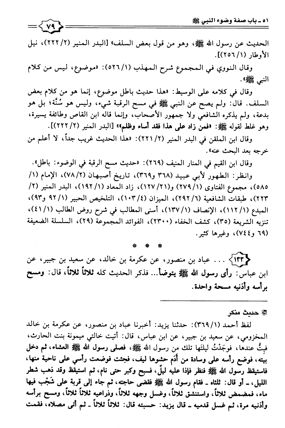 ١٣٣ - . . . عباد بن منصور، عن عكرمة بن خالد، عن سعيد بن جبير، عن ابن عباس: رأى رسول الله - صلى الله عليه وسلم - يتوضأ. . . فذكر الحديث كله ثلاثًا ثلاثًا، قال: ومسح برأسه وأذنيه مسحة واحدة.
