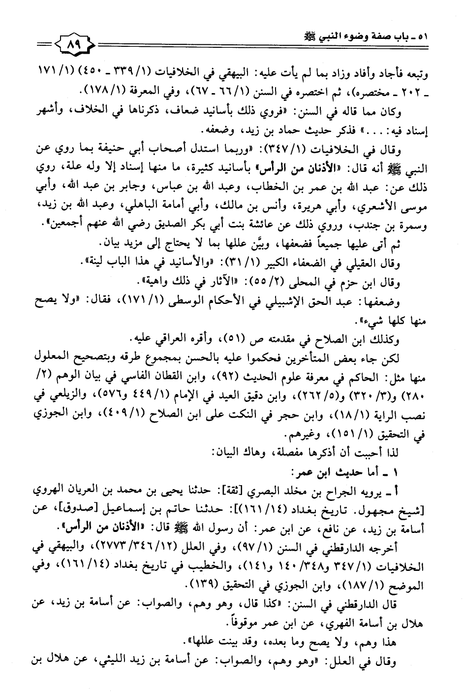 أ- يرويه الجراح بن مخلد البصري [ثقة]: حدثنا يحيى بن محمد بن العريان الهروي [شيخ مجهول. تاريخ بغداد (١٤/ ١٦١)]: حدثنا حاتم بن إسماعيل [صدوق]، عن أسامة بن زيد، عن نافع، عن ابن عمر: أن رسول الله - صلى الله عليه وسلم - قال: "الأذنان من الرأس".