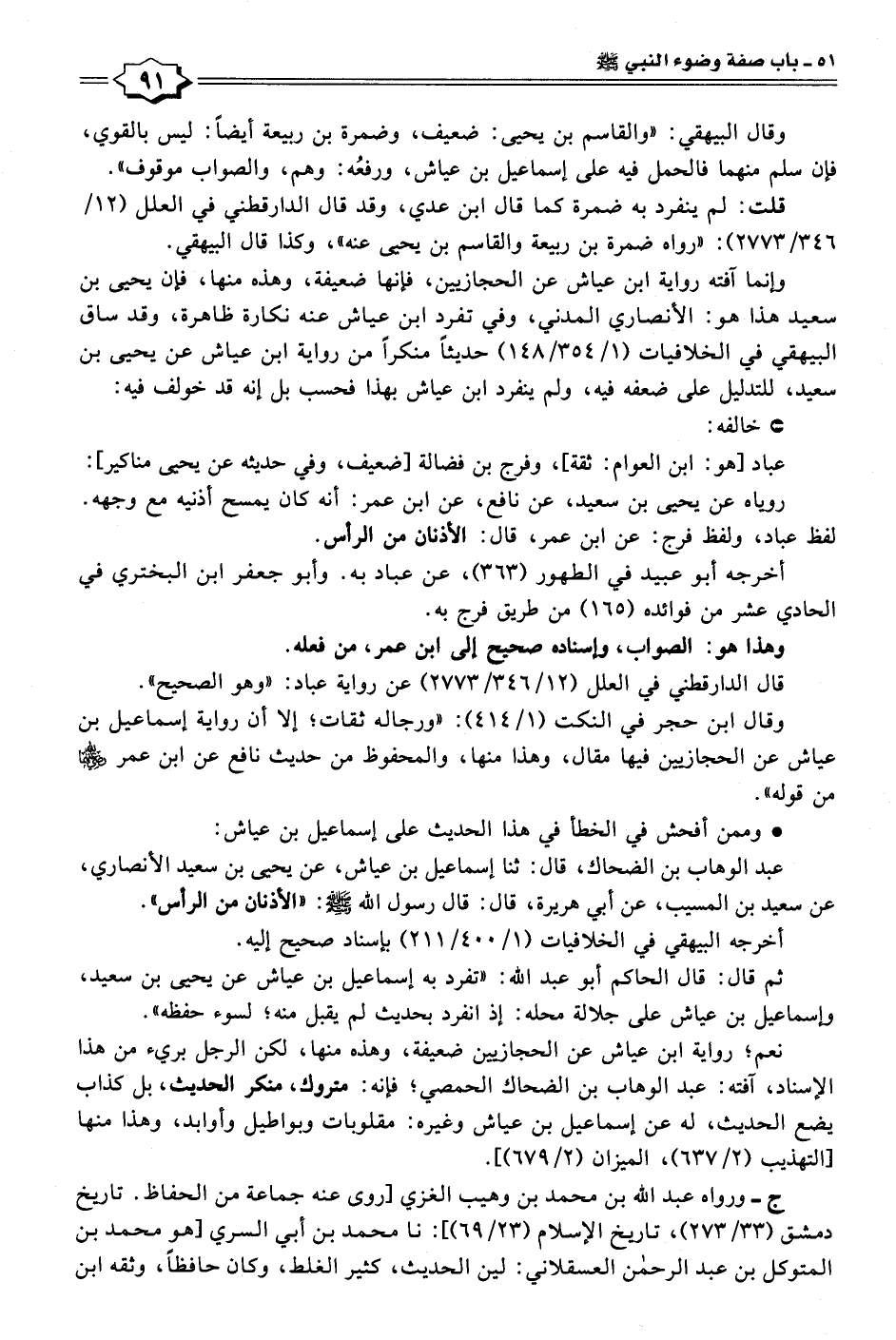 عباد [هو: ابن العوام: ثقة]، وفرج بن فضالة [ضعيف، وفي حديثه عن يحيى مناكير]: روياه عن يحيى بن سعيد، عن نافع، عن ابن عمر: أنه كان يمسح أذنيه مع وجهه.