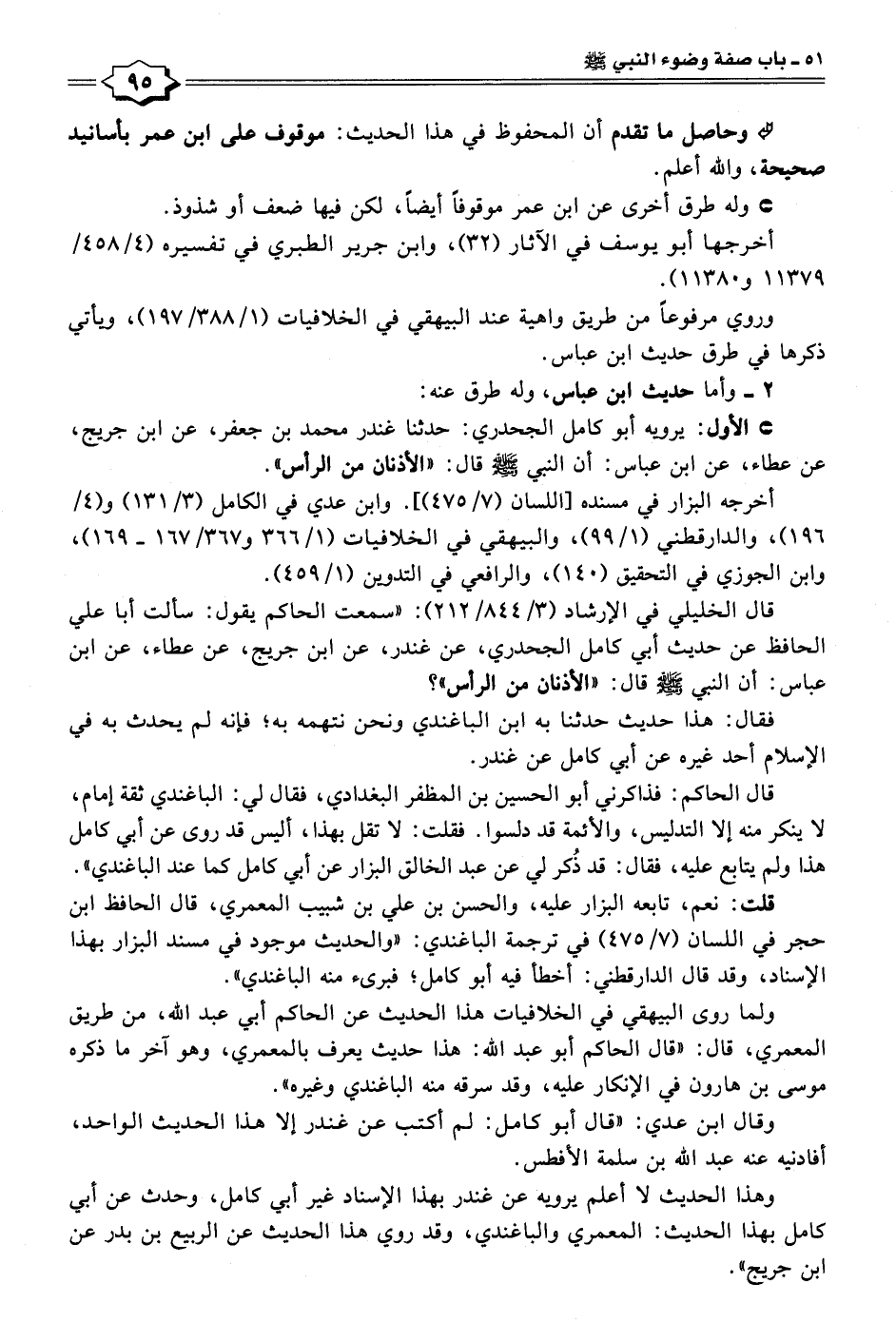 • الأول: يرويه أبو كامل الجحدري: حدثنا غندر محمد بن جعفر، عن ابن جريج، عن عطاء، عن ابن عباس: أن النبي - صلى الله عليه وسلم - قال: "الأذنان من الرأس".