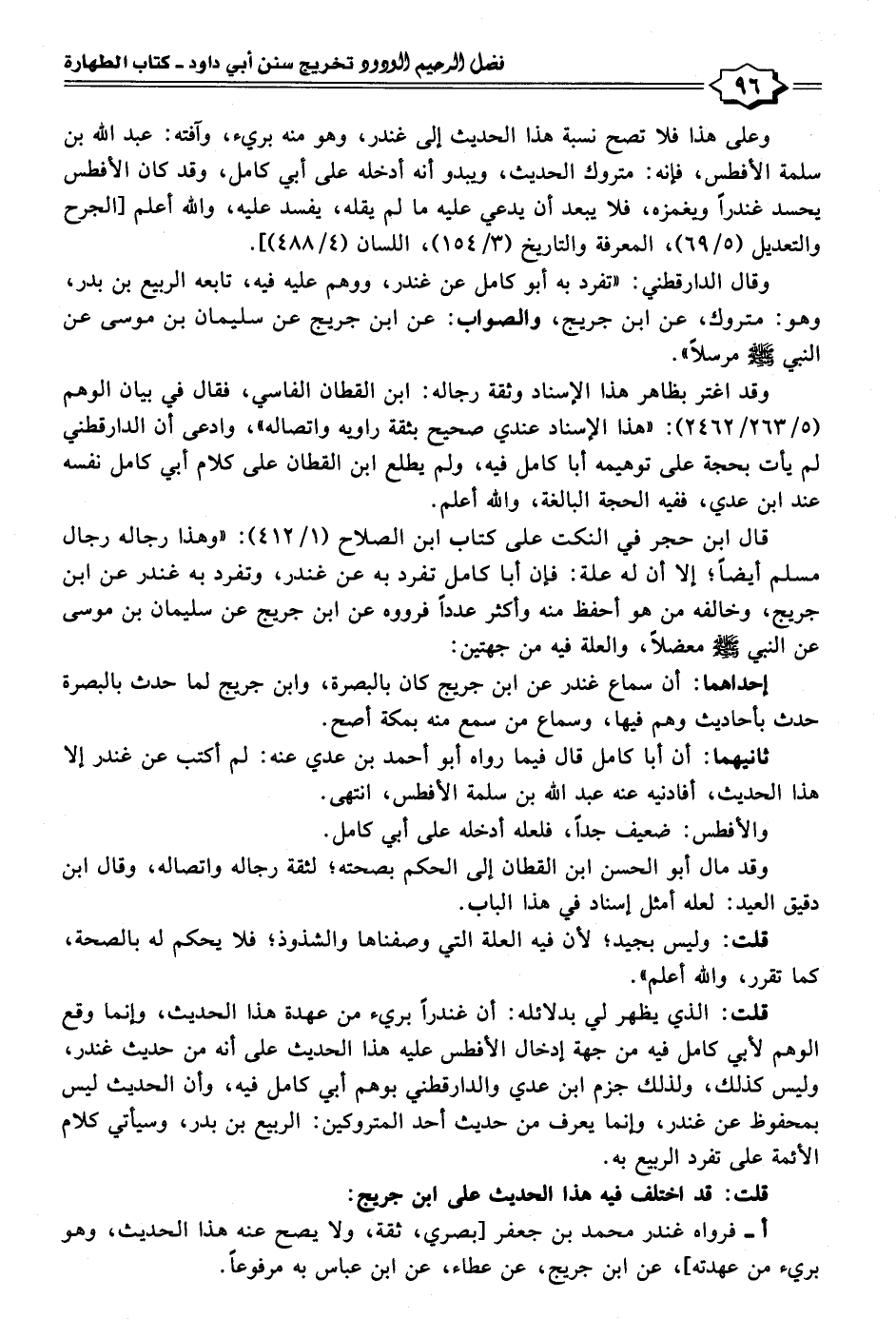 وقال الدارقطني: "تفرد به أبو كامل عن غندر، ووهم عليه فيه، تابعه الربيع بن بدر، وهو: متروك، عن ابن جريج، والصواب: عن ابن جريج عن سليمان بن موسى عن النبي - صلى الله عليه وسلم - مرسلًا".