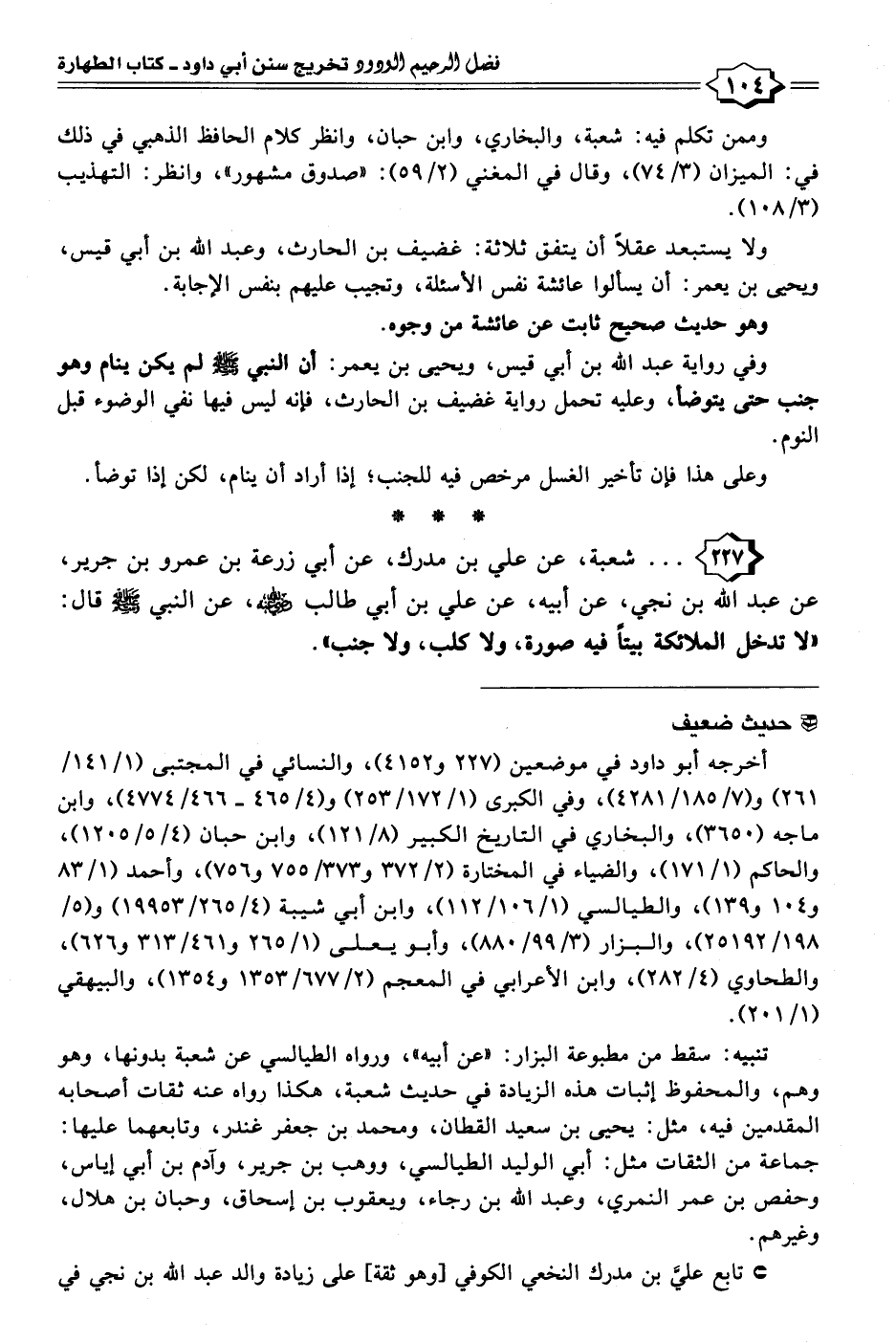 ٢٢٧ - . . . شعبة، عن علي بن مدرك، عن أبي زرعة بن عمرو بن جرير، عن عبد الله بن نجي، عن أبيه، عن علي بن أبي طالب - رضي الله عنه -، عن النبي - صلى الله عليه وسلم - قال: "لا تدخل الملائكة بيتًا فيه صورة، ولا كلب، ولا جنب".