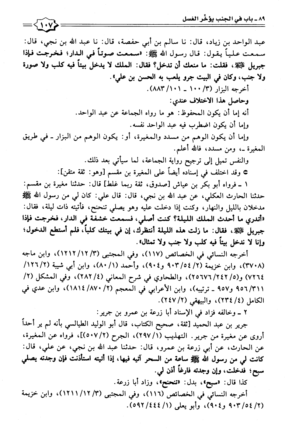 ١ - فرواه أبو بكر بن عياش [صدوق، ثقة ربما غلط] قال: حدثنا مغيرة بن مقسم: حدثنا الحارث العكلي، عن عبد الله بن نجي، قال: قال علي: كان لي من رسول الله - صلى الله عليه وسلم - مدخلان بالليل والنهار، وكنت إذا دخلت عليه وهو يصلي تنحنح، فأتيته ذات ليلة، فقال: "أتدري ما أحدث الملك الليلة؟ كنت أصلي، فسمعت خشفة في الدار، فخرجت فإذا جبريل -عليه السلام-، فقال: ما زلت هذه الليلة أنتظرك، إن في بيتك كلبًا، فلم أستطع الدخول؛ وإنا لا ندخل بيتًا فيه كلب ولا جنب ولا تمثال".