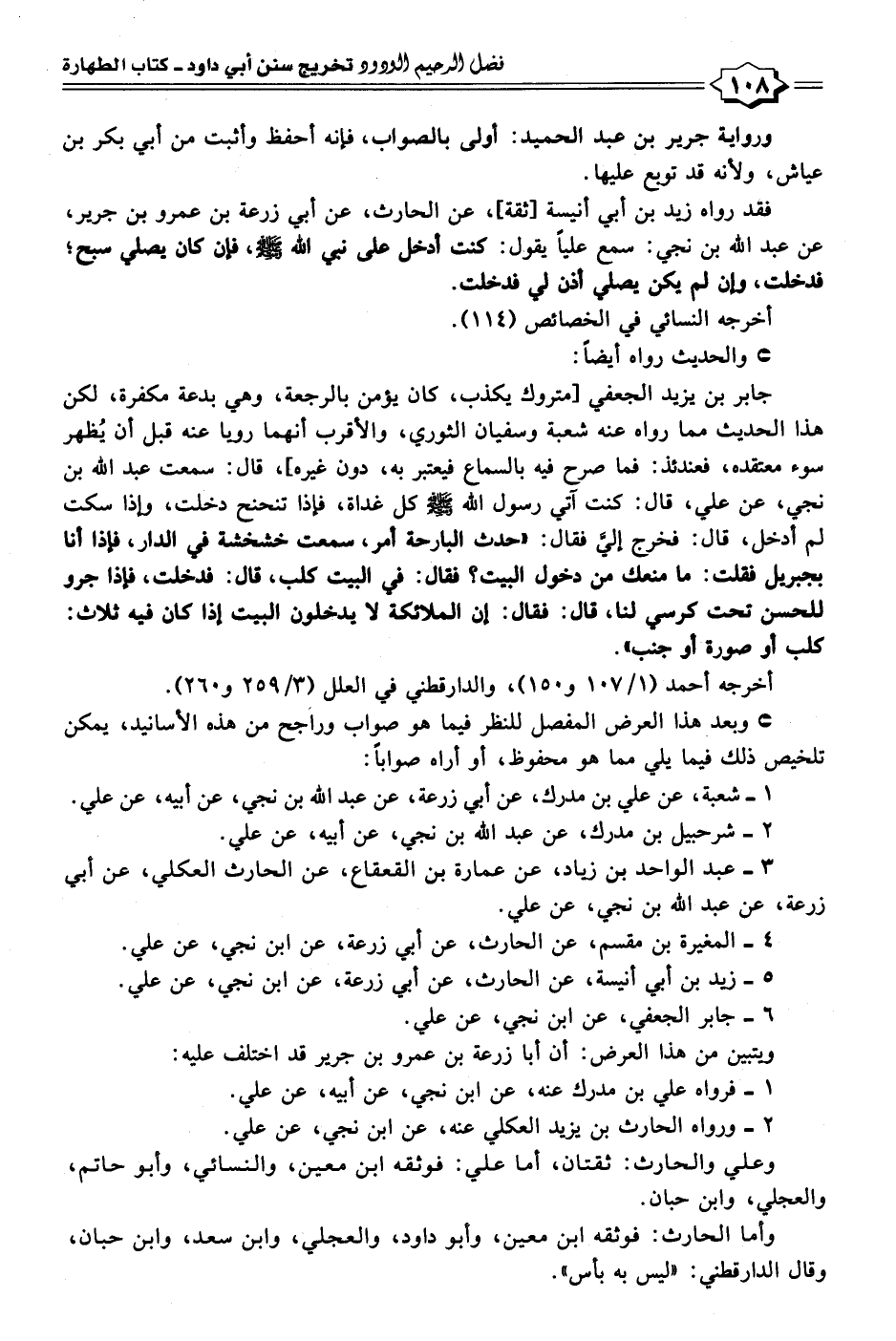 جابر بن يزيد الجعفي [متروك يكذب، كان يؤمن بالرجعة، وهي بدعة مكفرة، لكن هذا الحديث مما رواه عنه شعبة وسفيان الثوري، والأقرب أنهما رويا عنه قبل أن يُظهر سوء معتقده، فعندئذ: فما صرح فيه بالسماع فيعتبر به، دون غيره]، قال: سمعت عبد الله بن نجي، عن علي، قال: كنت آتي رسول الله - صلى الله عليه وسلم - كل غداة، فإذا تنحنح دخلت، وإذا سكت لم أدخل، قال: فخرج إليَّ فقال: "حدث البارحة أمر، سمعت خشخشة في الدار، فإذا أنا بجبريل فقلت: ما منعك من دخول البيت؟ فقال: في البيت كلب، قال: فدخلت، فإذا جرو للحسن تحت كرسي لنا، قال: فقال: إن الملائكة لا يدخلون البيت إذا كان فيه ثلاث: كلب أو صورة أو جنب".