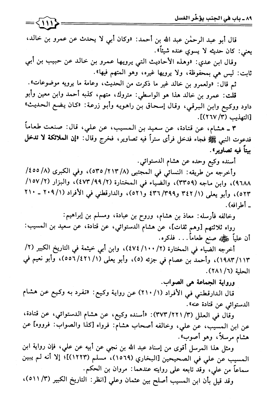 ٣ - هشام، عن قتادة، عن سعيد بن المسيب، عن علي، قال: صنعت طعامًا فدعوت النبي - صلى الله عليه وسلم - فجاء فدخل فرأى سترًا فيه تصاوير، فخرج وقال: "إن الملائكة لا تدخل بيتًا فيه تصاوير".