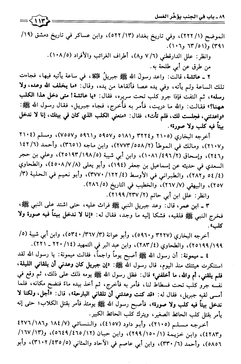 ٣ - ابن عمر، قال: وعد جبريل النبي - صلى الله عليه وسلم - فراث عليه، حتى اشتد على النبي - صلى الله عليه وسلم -، فخرج النبي - صلى الله عليه وسلم - فلقيه، فشكا إليه ما وجد، فقال له: "إنا لا ندخل بيتًا فيه صورة ولا كلب".