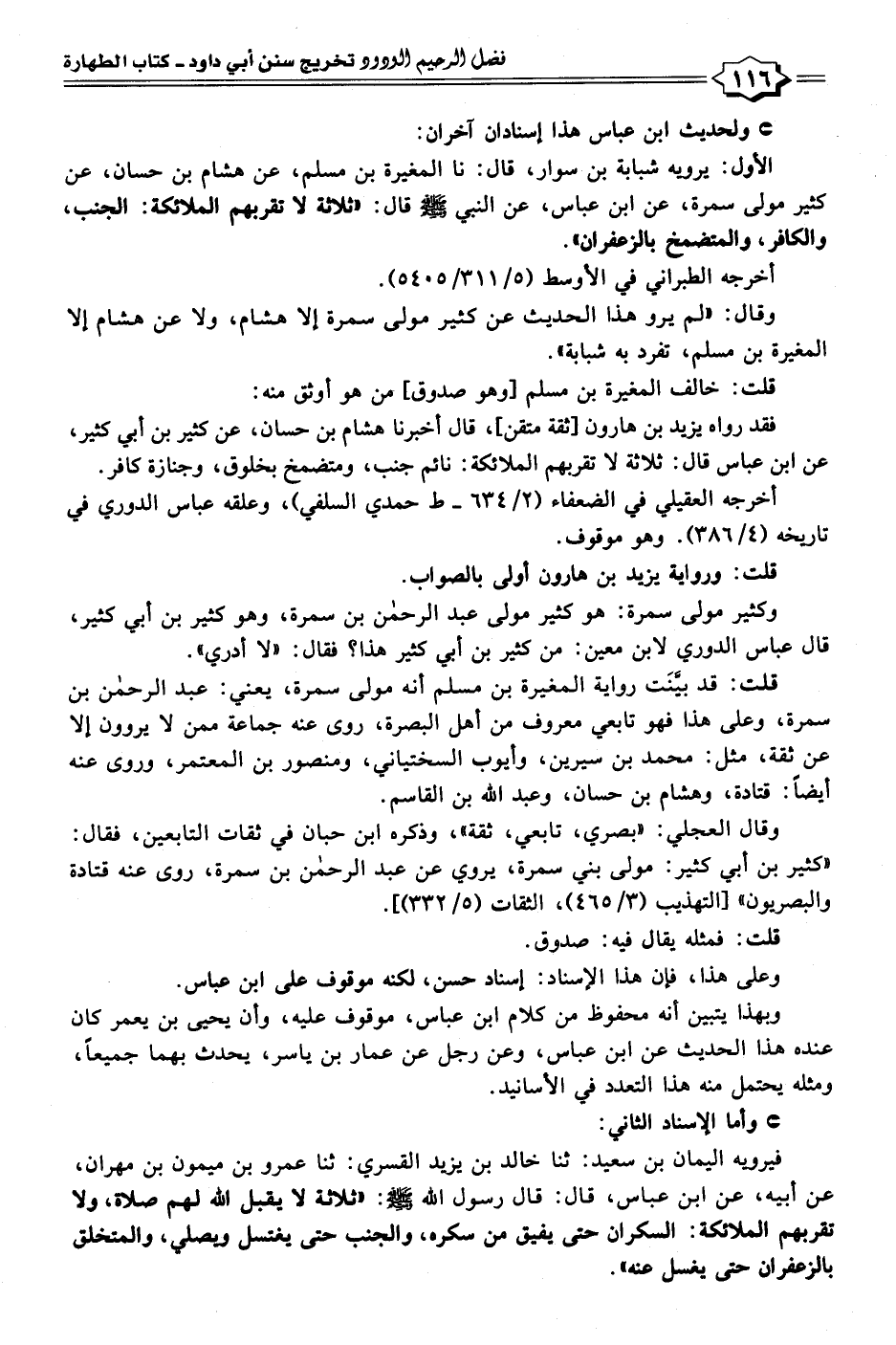 الأول: يرويه شبابة بن سوار، قال: نا المغيرة بن مسلم، عن هشام بن حسان، عن كثير مولى سمرة، عن ابن عباس، عن النبي - صلى الله عليه وسلم - قال: "ثلاثة لا تقربهم الملائكة: الجنب، والكافر، والمتضمخ بالزعفران".