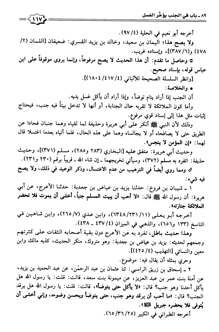 ١ - شيبان بن فروخ: حدثنا يزيد بن عياض بن جعدبة: حدثنا الأعرج، عن أبي هريرة: أن رسول الله - صلى الله عليه وسلم - قال: "لا أحب أن يبيت المسلم جنبًا، أخشى أن يموت فلا تحضر الملائكة جنازته".
