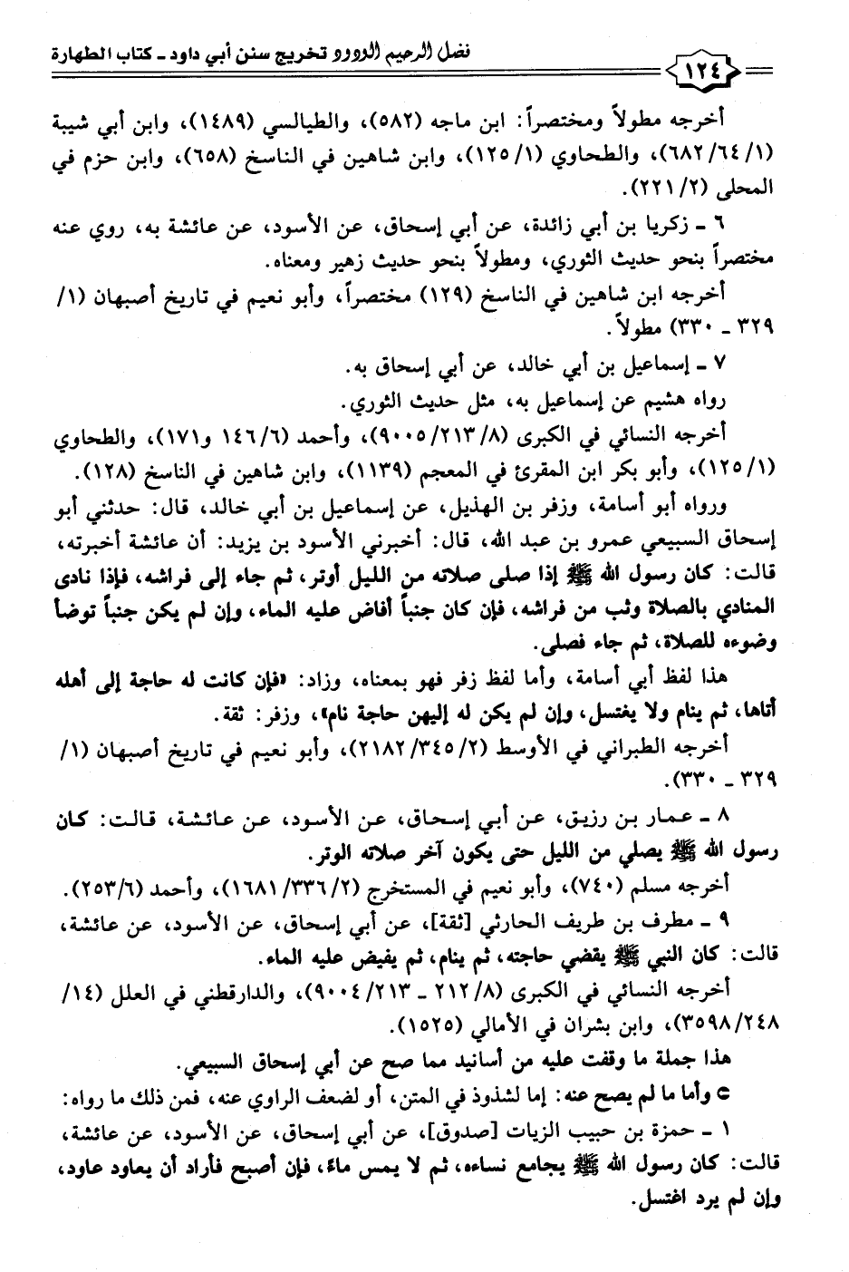 ١ - حمزة بن حبيب الزيات [صدوق]، عن أبي إسحاق، عن الأسود، عن عائشة، قالت: كان رسول الله - صلى الله عليه وسلم - يجامع نساءه، ثم لا يمس ماءً، فإن أصبح فأراد أن يعاود عاود، وإن لم يرد اغتسل.