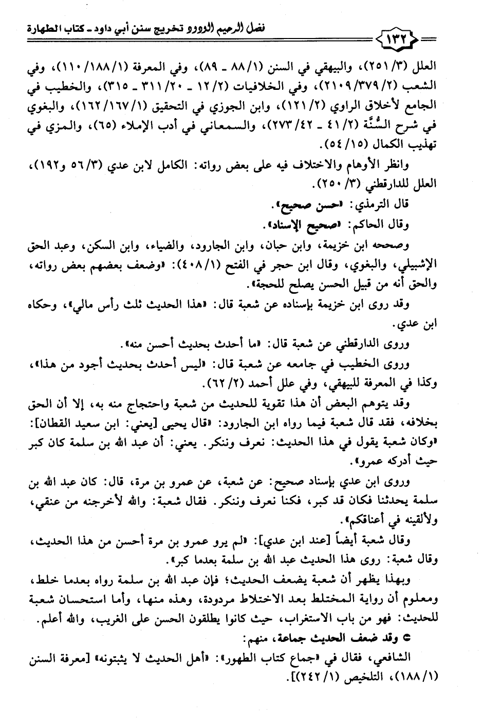 العلل (٣/ ٢٥١)، والبيهقي في السنن (١/ ٨٨ - ٨٩)، وفي المعرفة (١/ ١٨٨/ ١١٠)، وفي الشعب (٢/ ٣٧٩/ ٢١٠٩)، وفي الخلافيات (٢/ ١٢ - ٢٠/ ٣١١ - ٣١٥)، والخطيب في الجامع لأخلاق الراوي (٢/ ١٢١)، وابن الجوزي في التحقيق (١/ ١٦٧/ ١٦٢)، والبغوي في شرح السُّنَّة (٢/ ٤١ - ٤٢/ ٢٧٣)، والسمعاني في أدب الإملاء (٦٥)، والمزي في تهذيب الكمال (١٥/ ٥٤).