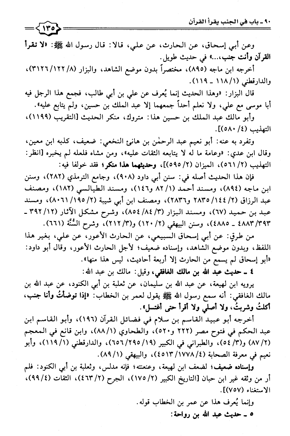 وعن أبي إسحاق، عن الحارث، عن علي، قالا: قال رسول الله - صلى الله عليه وسلم -: "لا تقرأ القرآن وأنت جنب، ... " في حديث طويل.