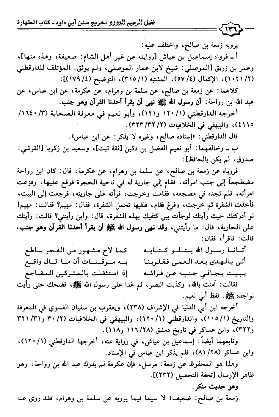 كلاهما: عن زمعة بن صالح، عن سلمة بن وهرام، عن عكرمة، عن ابن عباس، عن عبد الله بن رواحة: أن رسول الله - صلى الله عليه وسلم - نهى أن يقرأ أحدنا القرآن وهو جنب.