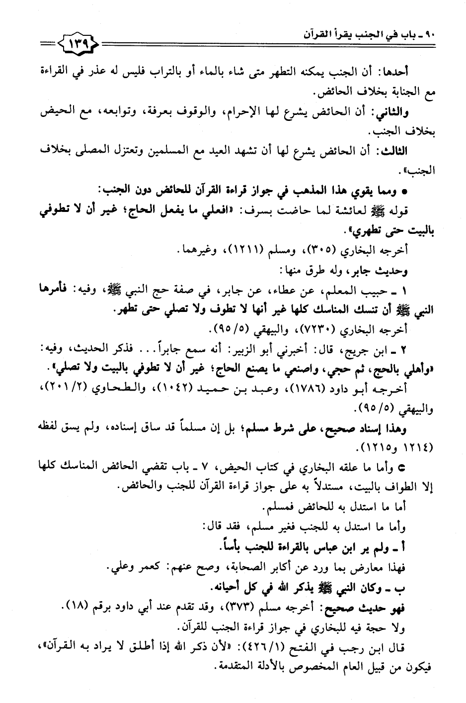 • ومما يقوي هذا المذهب في جواز قراءة القرآن للحائض دون الجنب: قوله - صلى الله عليه وسلم - لعائشة لما حاضت بسرف: "افعلي ما يفعل الحاج؛ غير أن لا تطوفي بالبيت حتى تطهري".