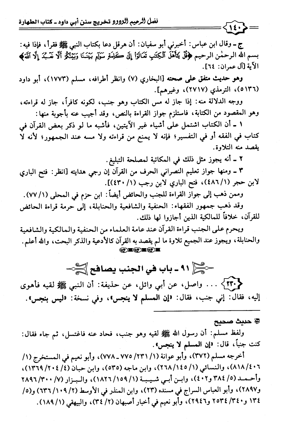 ٢٣٠ - . . . واصل، عن أبي وائل، عن حذيفة: أن النبي - صلى الله عليه وسلم - لقيه فأهوى إليه، فقال: إني جنب، فقال: "إن المسلم لا ينجس"، وفي نسخة: "ليس بنجس".