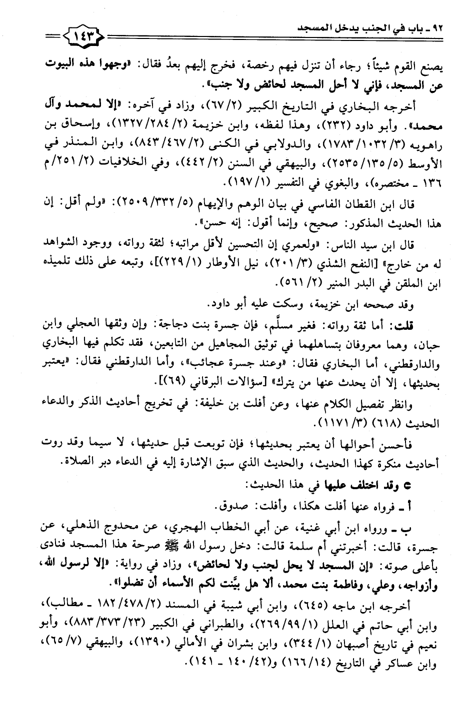 ب- ورواه ابن أبي غنية، عن أبي الخطاب الهجري، عن محدوج الذهلي، عن جسرة، قالت: أخبرتني أم سلمة قالت: دخل رسول الله - صلى الله عليه وسلم - صرحة هذا المسجد فنادى بأعلى صوته: "إن المسجد لا يحل لجنب ولا لحائض"، وزاد في رواية: "إلا لرسول الله، وأزواجه، وعلي، وفاطمة بنت محمد، ألا هل بيَّنت لكم الأسماء أن تضلوا".