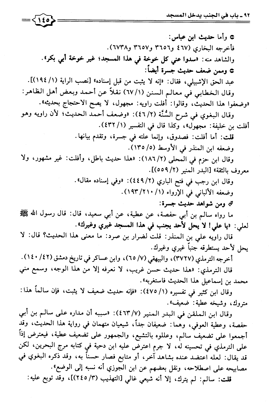 ما رواه سالم بن أبي حفصة، عن عطية، عن أبي سعيد، قال: قال رسول الله - صلى الله عليه وسلم - لعلي: "يا علي! لا يحل لأحد يجنب في هذا المسجد غيري وغيرك".