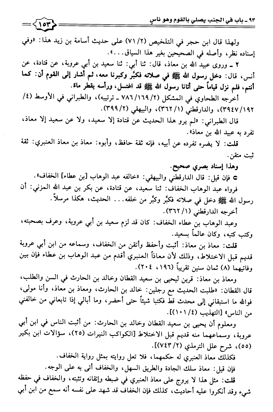 قلت: معاذ بن معاذ: أثبت وأحفظ وأتقن من الخفاف، وسماعه من ابن أبي عروبة قديم قبل الاختلاط، وذلك لأن معاذًا العنبري أقدم من عبد الوهاب بن عطاء فإن بين وفاتيهما (٨) ثمان سنين تقريبًا (١٩٦، ٢٠٤).