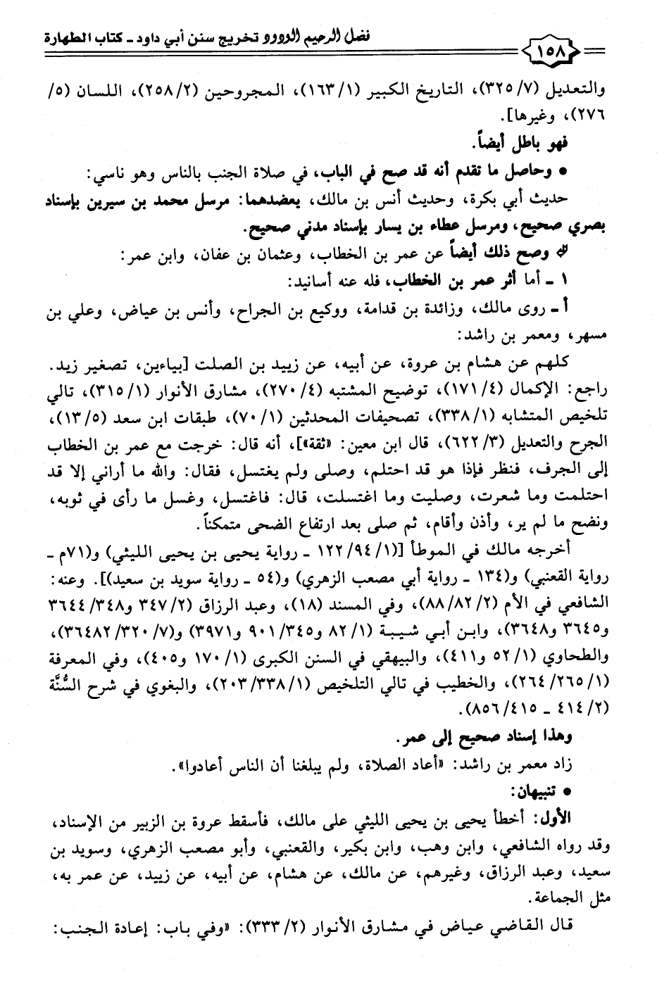 كلهم عن هشام بن عروة، عن أبيه، عن زييد بن الصلت [بياءين، تصغير زيد. راجع: الإكمال (٤/ ١٧١)، توضيح المشتبه (٤/ ٢٧٠)، مشارق الأنوار (١/ ٣١٥)، تالي تلخيص المتشابه (١/ ٣٣٨)، تصحيفات المحدثين (١/ ٧٠)، طبقات ابن سعد (٥/ ١٣)، الجرح والتعديل (٣/ ٦٢٢)، قال ابن معين: "ثقة"]، أنه قال: خرجت مع عمر بن الخطاب إلى الجرف، فنظر فإذا هو قد احتلم، وصلى ولم يغتسل، فقال: والله ما أراني إلا قد احتلمت وما شعرت، وصليت وما اغتسلت، قال: فاغتسل، وغسل ما رأى في ثوبه، ونضح ما لم ير، وأذن وأقام، ثم صلى بعد ارتفاع الضحى متمكنًا.