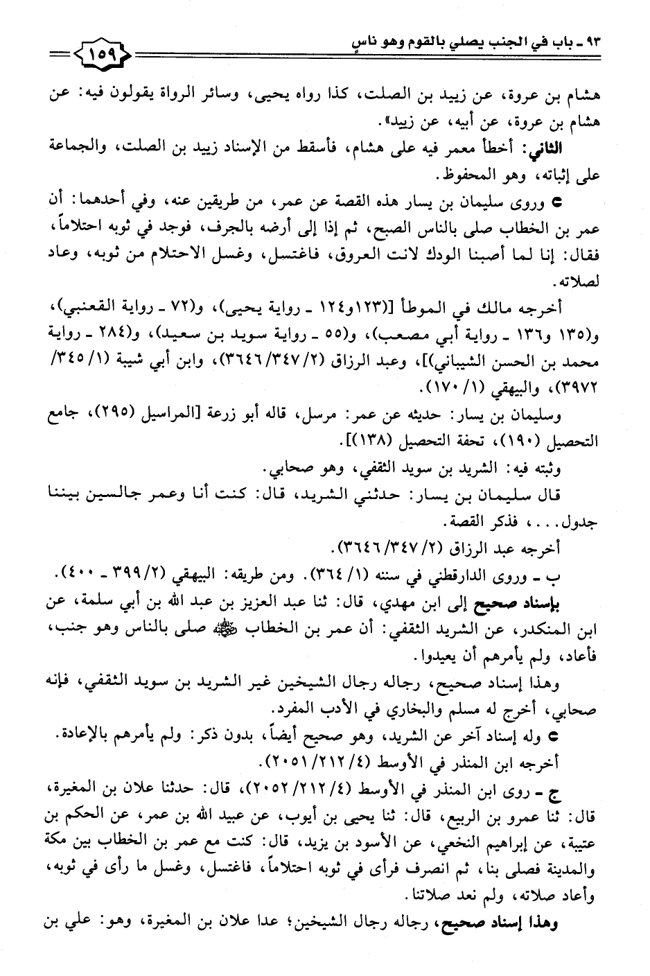 ج- روى ابن المنذر في الأوسط (٤/ ٢١٢/ ٢٠٥٢)، قال: حدثنا علان بن المغيرة، قال: ثنا عمرو بن الربيع، قال: ثنا يحيى بن أيوب، عن عبيد الله بن عمر، عن الحكم بن عتيبة، عن إبراهيم النخعي، عن الأسود بن يزيد، قال: كنت مع عمر بن الخطاب بين مكة والمدينة فصلى بنا، ثم انصرف فرأى في ثوبه احتلامًا، فاغتسل، وغسل ما رأى في ثوبه، وأعاد صلاته، ولم نعد صلاتنا.
