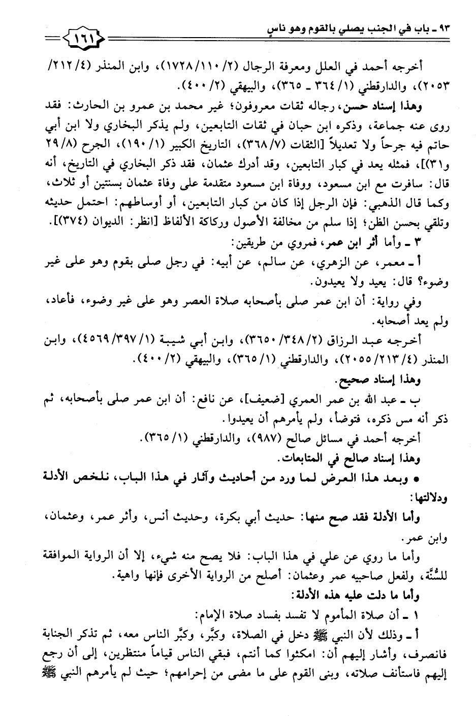 ب- عبد الله بن عمر العمري [ضعيف]، عن نافع: أن ابن عمر صلى بأصحابه، ثم ذكر أنه مس ذكره، فتوضأ، ولم يامرهم أن يعيدوا.