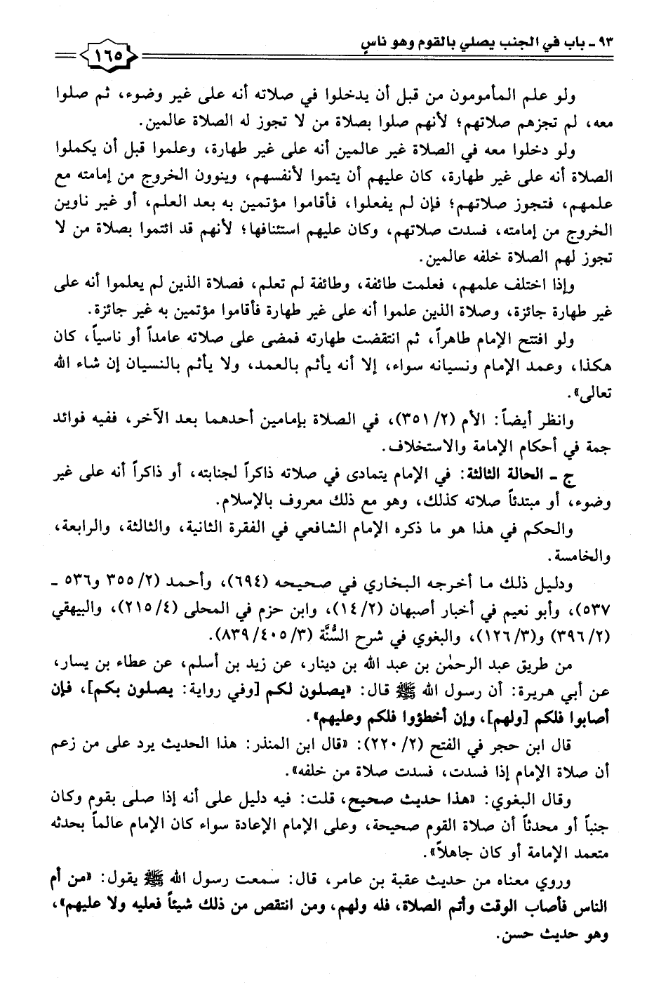 ج- الحالة الثالثة: في الإمام يتمادى في صلاته ذاكرًا لجنابته، أو ذاكرًا أنه على غير وضوء، أو مبتدئًا صلاته كذلك، وهو مع ذلك معروف بالإسلام.