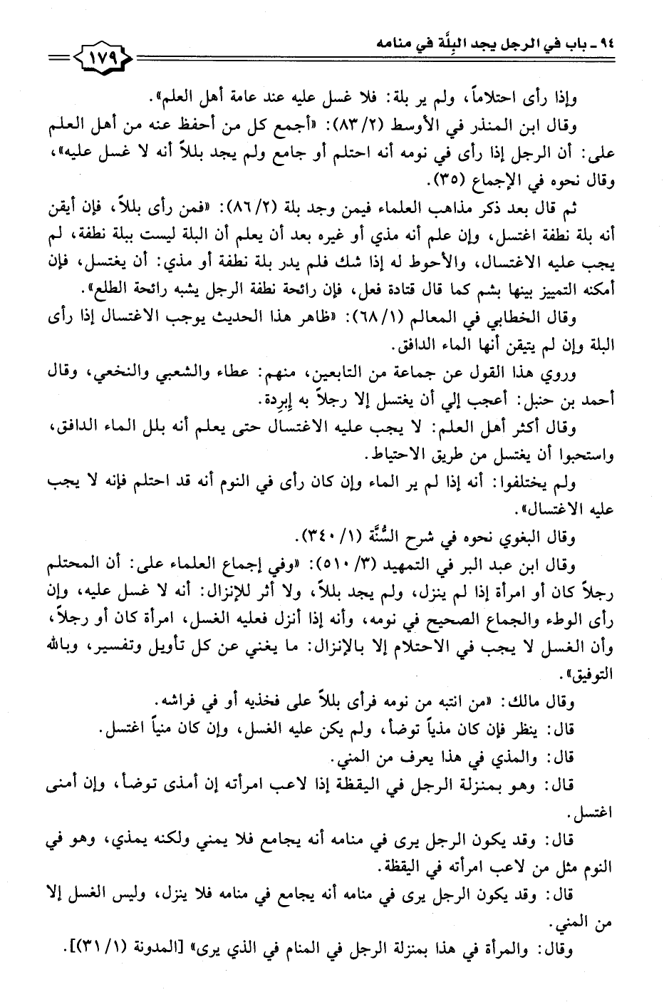 وقال مالك: "من انتبه من نومه فرأى بللًا على فخذيه أو في فراشه.