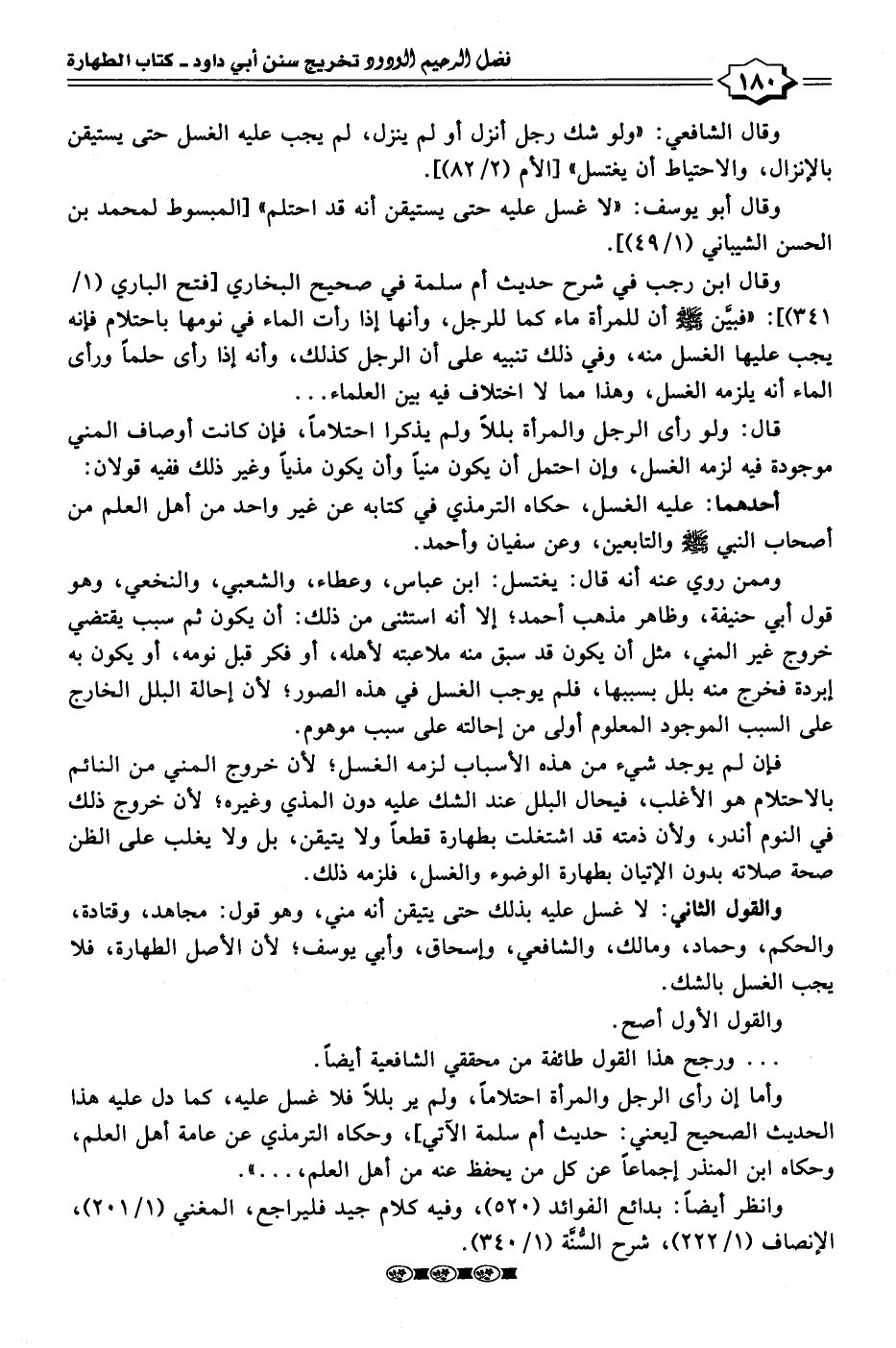 وقال ابن رجب في شرح حديث أم سلمة في صحيح البخاري [فتح الباري (١/ ٣٤١)]: "فبيَّن - صلى الله عليه وسلم - أن للمرأة ماء كما للرجل، وأنها إذا رأت الماء في نومها باحتلام فإنه يجب عليها الغسل منه، وفي ذلك تنبيه على أن الرجل كذلك، وأنه إذا رأى حلمًا ورأى الماء أنه يلزمه الغسل، وهذا مما لا اختلاف فيه بين العلماء ...