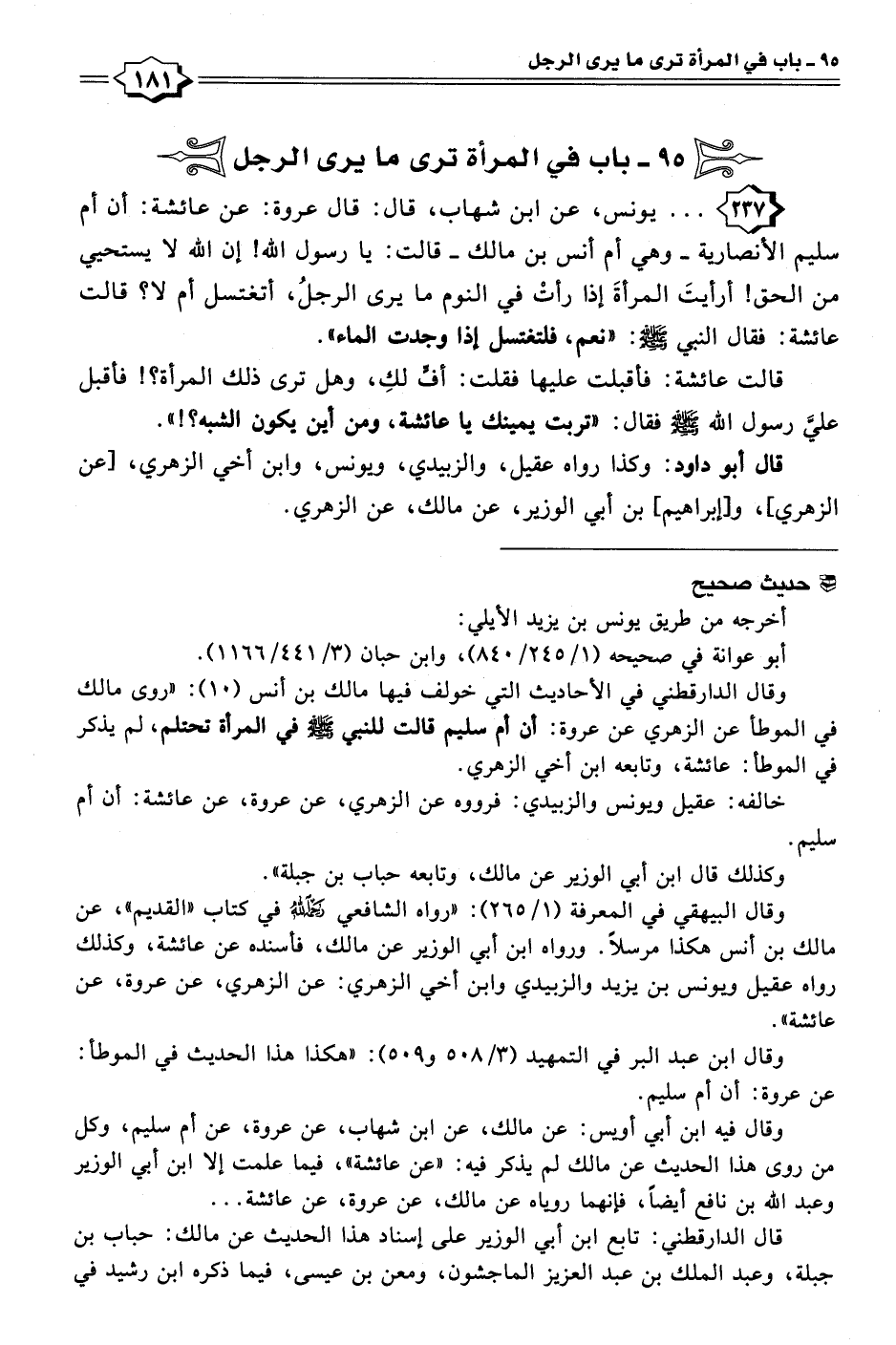 ٢٣٧ - . . . يونس، عن ابن شهاب، قال: قال عروة: عن عائشة: أن أم سليم الأنصارية -وهي أم أنس بن مالك- قالت: يا رسول الله! إن الله لا يستحيي من الحق! أرأيتَ المرأةَ إذا رأتْ في النوم ما يرى الرجلُ، أتغتسل أم لا؟ قالت عائشة: فقال النبي - صلى الله عليه وسلم -: "نعم، فلتغتسل إذا وجدت الماء".
