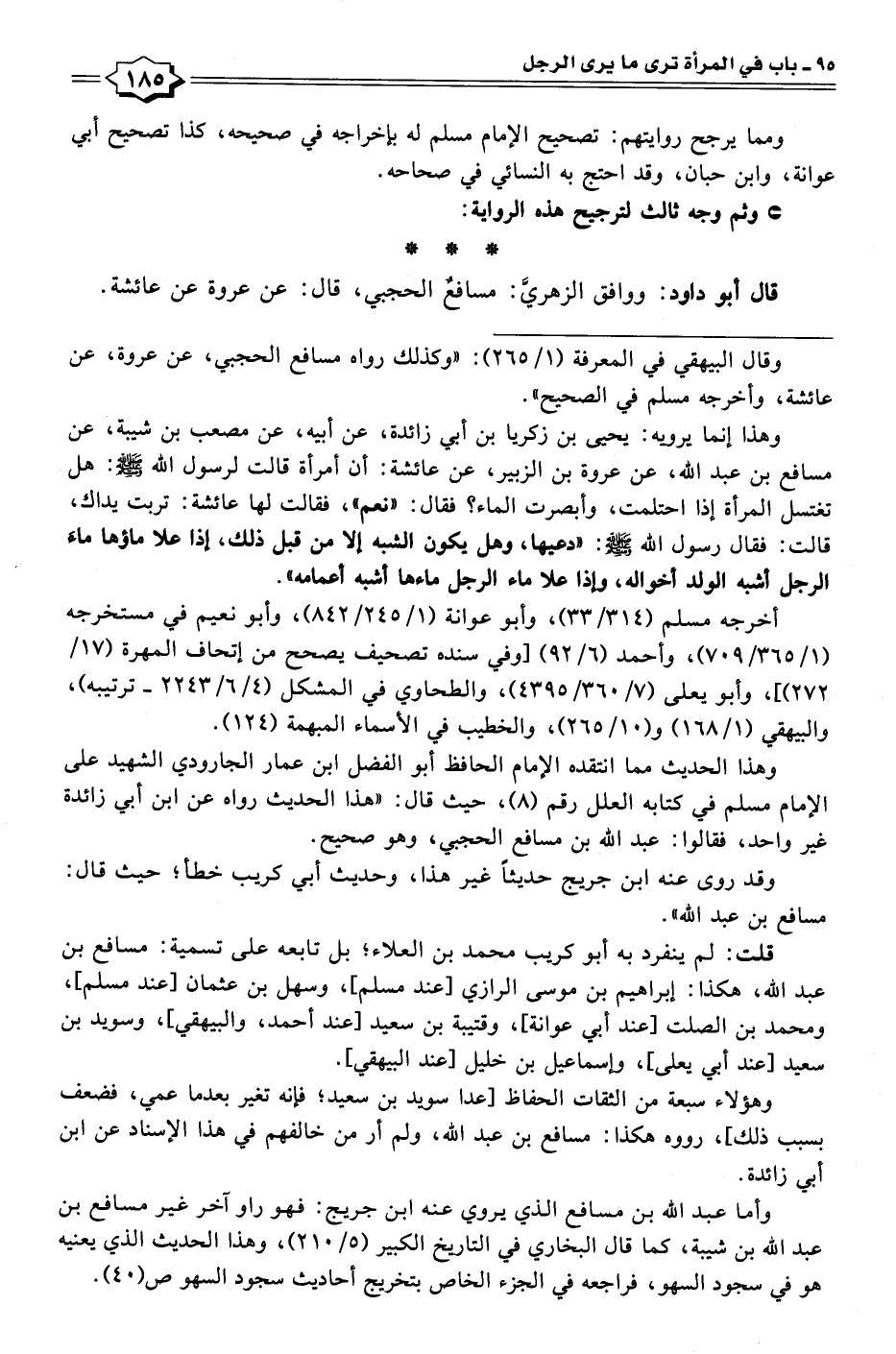 وهذا إنما يرويه: يحيى بن زكريا بن أبي زائدة، عن أبيه، عن مصعب بن شيبة، عن مسافع بن عبد الله، عن عروة بن الزبير، عن عائشة: أن أمرأة قالت لرسول الله - صلى الله عليه وسلم -: هل تغتسل المرأة إذا احتلمت، وأبصرت الماء؟ فقال: "نعم"، فقالت لها عائشة: تربت يداك، قالت: فقال رسول الله - صلى الله عليه وسلم -: "دعيها، وهل يكون الشبه إلا من قبل ذلك، إذا علا ماؤها ماء الرجل أشبه الولد أخواله، وإذا علا ماء الرجل ماءها أشبه أعمامه".