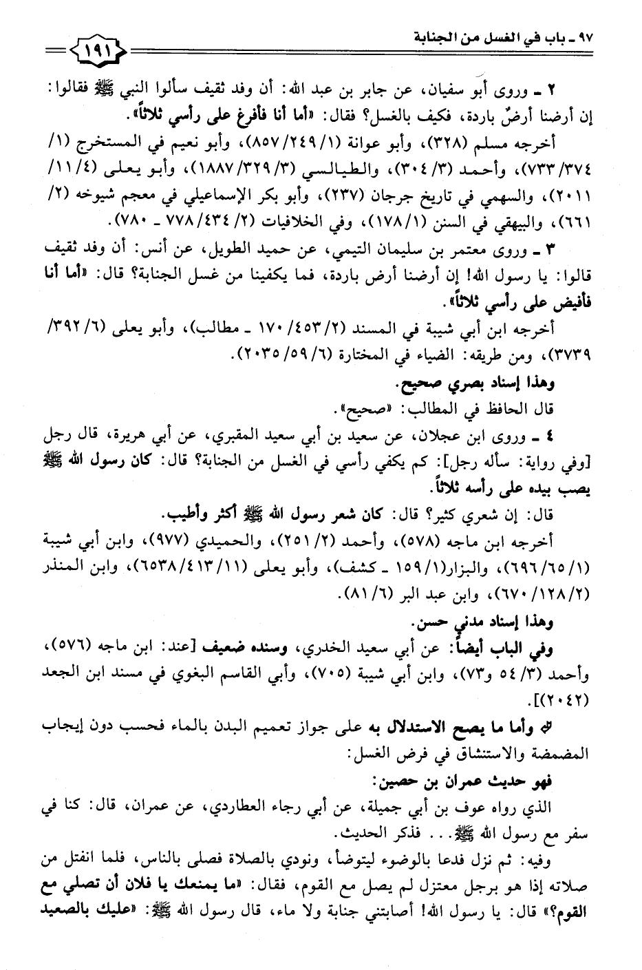 ٢ - وروى أبو سفيان، عن جابر بن عبد الله: أن وفد ثقيف سألوا النبي - صلى الله عليه وسلم - فقالوا: إن أرضنا أرضٌ باردة، فكيف بالغسل؟ فقال: "أما أنا فأفرغ على رأسي ثلاثًا".