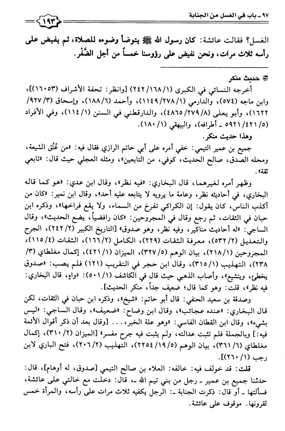 قلت: قد خولف فيه: خالفه: العلاء بن صالح التيمي [صدوق، له أوهام]، قال: حدثنا جميع بن عمير -رجل من بني تيم الله-، قال: دخلت مع خالتي على عائشة، فسألتها -أو قال: ذكرت الجنابة-: الرجل يكفيه ثلاث مرات على رأسه، والمرأة خمس لقرونها. موقوف على عائشة.