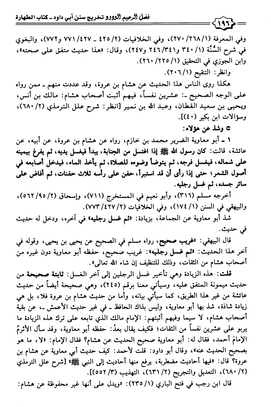 قلت: هذه الزيادة وهي تأخير غسل الرجلين إلى آخر الغسل: ثابتة صحيحة من حديث ميمونة المتفق عليه، وسيأتي معنا برقم (٢٤٥)، وهي صحيحة أيضًا من حديث عائشة من غير هذا الطريق، كما سيأتي بيانه، وأما من حديث هشام بن عروة فلا، بل هي زيادة شاذة، شذ بها أبو معاوية، وليس بذاك الحافظ -في غير حديث الأعمش-، عن بقية أصحاب هشام، لا سيما وفيهم أثبتهم: الإمام مالك الذي تابعه على ترك هذه الزيادة ما يربو على عشرين نفسًا من الثقات؛ فكيف يقال بعدُ: حفظه أبو معاوية، وقد سأل الأثرمُ الإمامَ أحمد، فقال له: أبو معاوية صحيح الحديث عن هشام؟ فقال الإمام: "لا، ما هو بصحيح الحديث عنه"، وقال أبو داود: قلت لأحمد: كيف حديث أبي معاوية عن هشام بن عروة؟ قال: "فيها أحاديث مضطربة، يرفع منها أحاديث إلى النبي - صلى الله عليه وسلم -[شرح علل الترمذي (٢/ ٦٨٠)، التعديل والتجريح (٢/ ٦٣١)، التهذيب (٣/ ٥٥٢)].