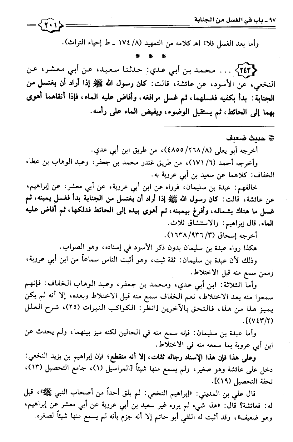 ٢٤٣ - . . . محمد بن أبي عدي: حدثنا سعيد، عن أبي معشر، عن النخعي، عن الأسود، عن عائشة، قالت: كان رسول الله - صلى الله عليه وسلم - إذا أراد أن يغتسل من الجنابة: بدأ بكفيه فغسلهما، ثم غسل مراففه، وأفاض عليه الماء، فإذا أنقاهما أهوى بهما إلى الحائط، ثم يستقبل الوضوء، ويفيض الماء على رأسه.