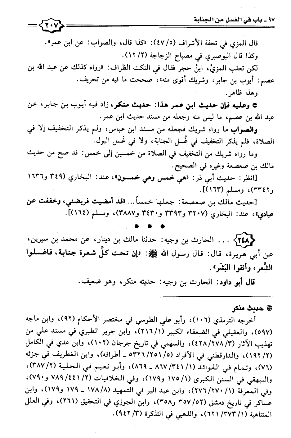 ٢٤٨ - . . . الحارث بن وجيه: حدثنا مالك بن دينار، عن محمد بن سيرين، عن أبي هريرة، قال: قال رسول الله - صلى الله عليه وسلم -: "إن تحت كلِّ شعرة جنابة، فاغسلوا الشَّعر، وأنقوا البَشَر".