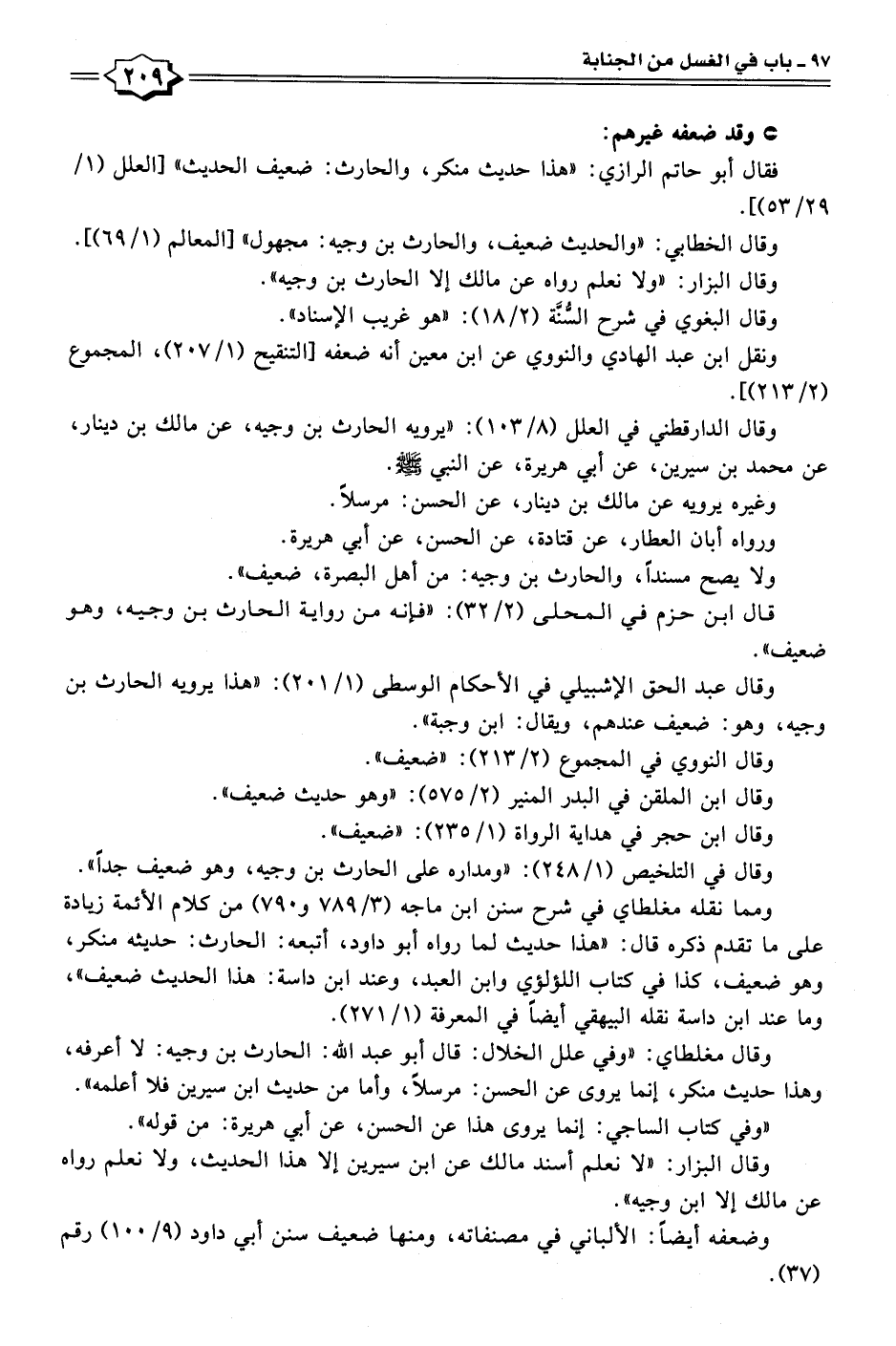 ومما نقله مغلطاي في شرح سنن ابن ماجه (٣/ ٧٨٩ و ٩٧٠) من كلام الأئمة زيادة على ما تقدم ذكره قال: "هذا حديث لما رواه أبو داود، أتبعه: الحارث: حديثه منكر، وهو ضعيف، كذا في كتاب اللؤلؤي وابن العبد، وعند ابن داسة: هذا الحديث ضعيف"، وما عند ابن داسة نقله البيهقي أيضًا في المعرفة (١/ ٢٧١).