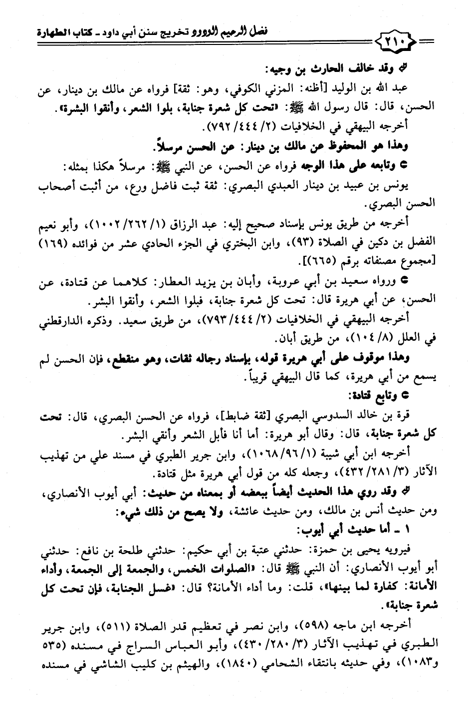• ورواه سعيد بن أبي عروبة، وأبان بن يزيد العطار: كلاهما عن قتادة، عن الحسن، عن أبي هريرة قال: تحت كل شعرة جنابة، فبلوا الشعر، وأنقوا البشر.