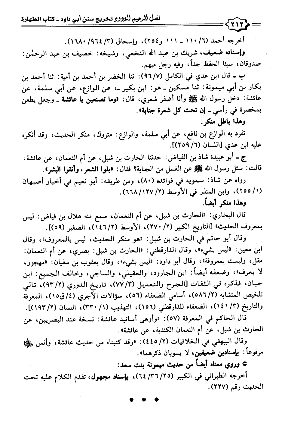 ج- أبو عبيدة شاذ بن الفياض: حدثنا الحارث بن شبل، عن أم النعمان، عن عائشة، قالت: سئل رسول الله - صلى الله عليه وسلم - عن الغسل من الجنابة؟ فقال: "بلوا الشعر، وأنقوا البشر".