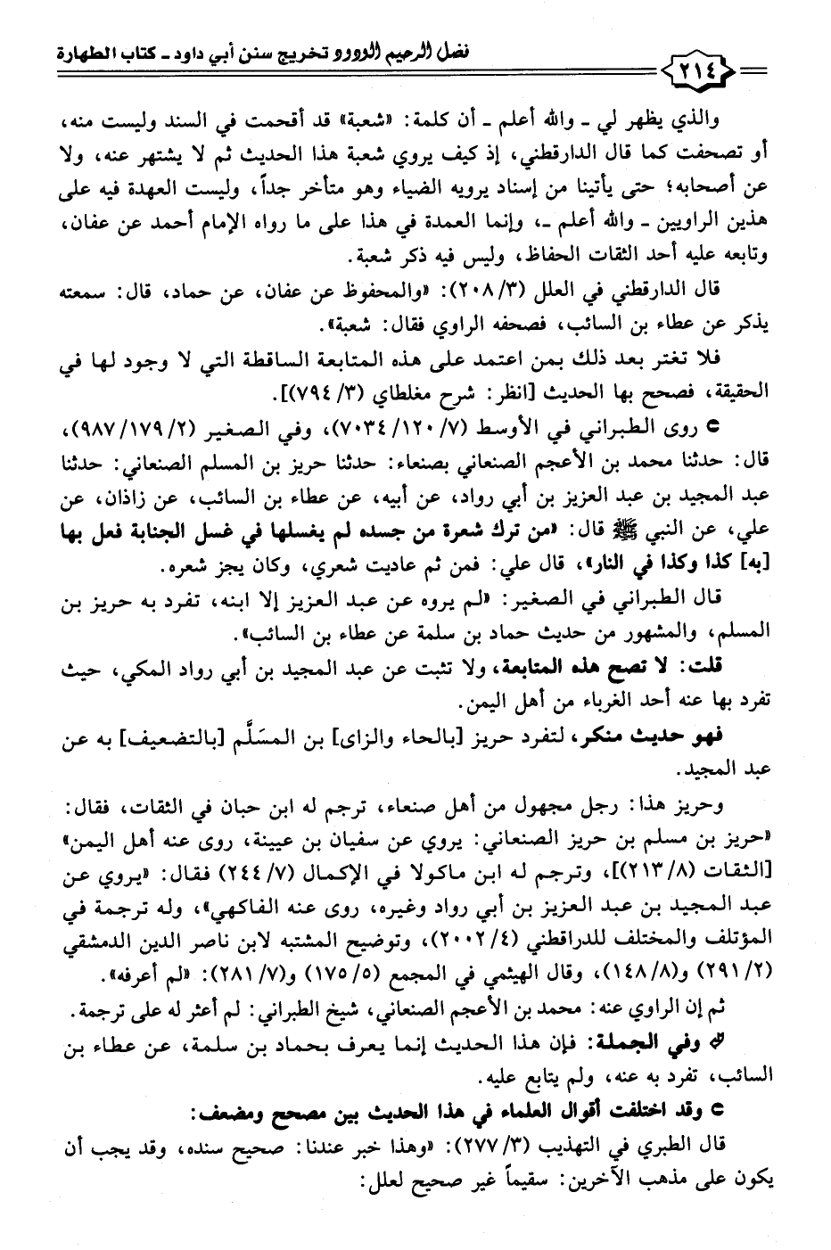 • روى الطبراني في الاوسط (٧/ ١٢٠/ ٧٠٣٤)، وفي الصغير (٢/ ١٧٩/ ٩٨٧)، قال: حدثنا محمد بن الأعجم الصنعاني بصنعاء: حدثنا حريز بن المسلم الصنعاني: حدثنا عبد المجيد بن عبد العزيز بن أبي رواد، عن أبيه، عن عطاء بن السائب، عن زاذان، عن علي، عن النبي - صلى الله عليه وسلم - قال: "من ترك شعرة من جسده لم يغسلها في غسل الجنابة فعل بها [به] كذا وكذا في النار"، قال علي: فمن ثم عاديت شعري، وكان يجز شعره.