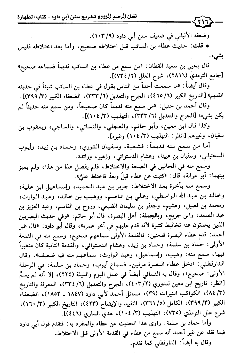 وأما حماد بن سلمة: راوي هذا الحديث عن عطاء والمتفرد به: فتقدم قول أبي داود فيما نقله عن غير أحمد أنه سمع من عطاء في القدمة الأولى قبل الاختلاط.