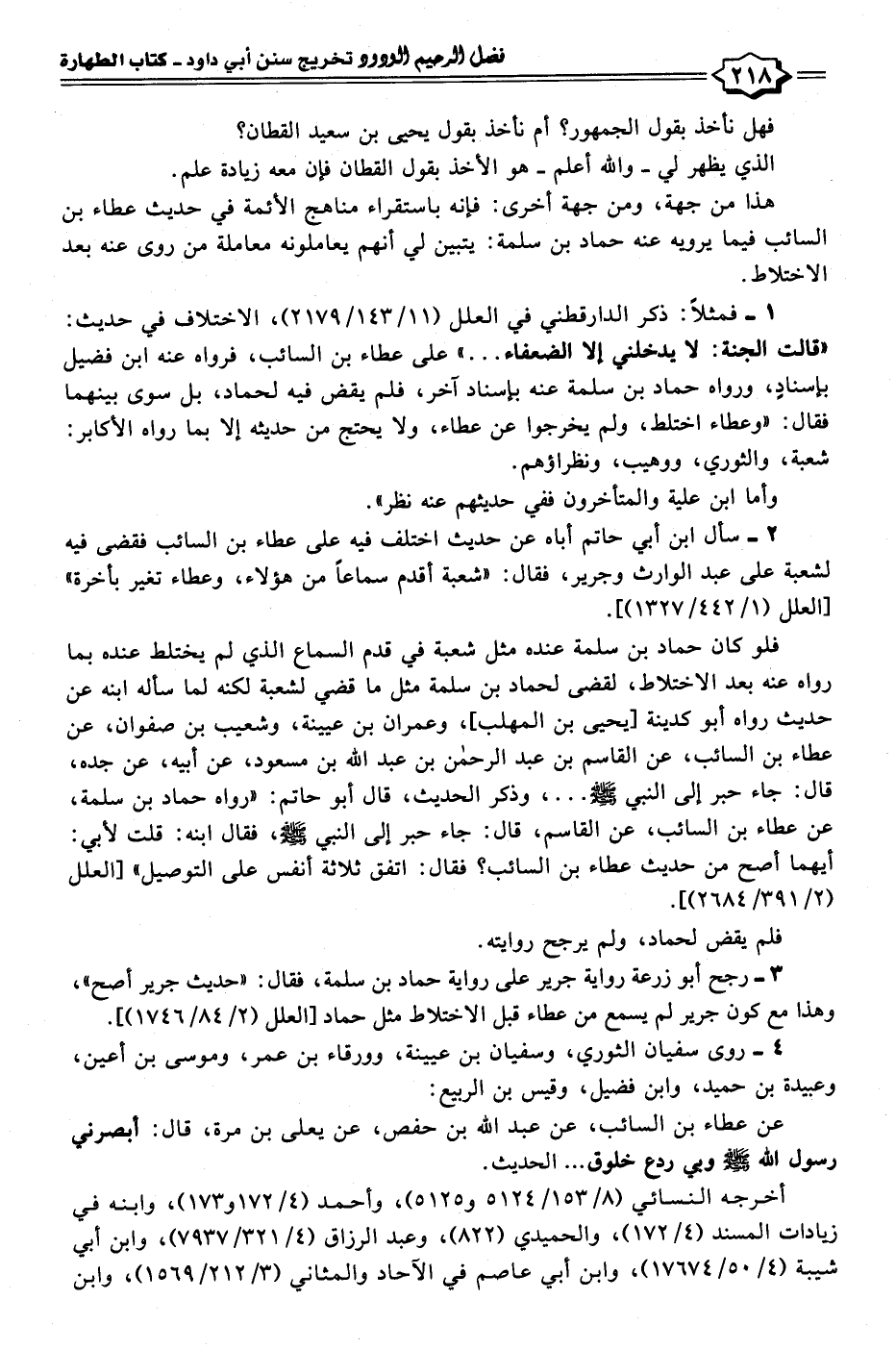 ٣ - رجح أبو زرعة رواية جرير على رواية حماد بن سلمة، فقال: "حديث جرير أصح"، وهذا مع كون جرير لم يسمع من عطاء قبل الاختلاط مثل حماد [العلل (٢/ ١٧٤٦/٨٤)].
