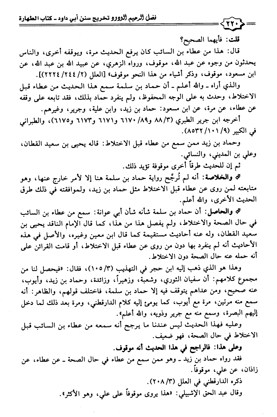 • والخلاصة: أنَّه لم تُرجَّح رواية حماد بن سلمة هنا إلا لأمر خارج عنها، وهو متابعته لمن روى عن عطاء قبل الاختلاط مثل حماد بن زبد، ولموافقته في ذلك طرق الحديث الأخرى، والله أعلم.