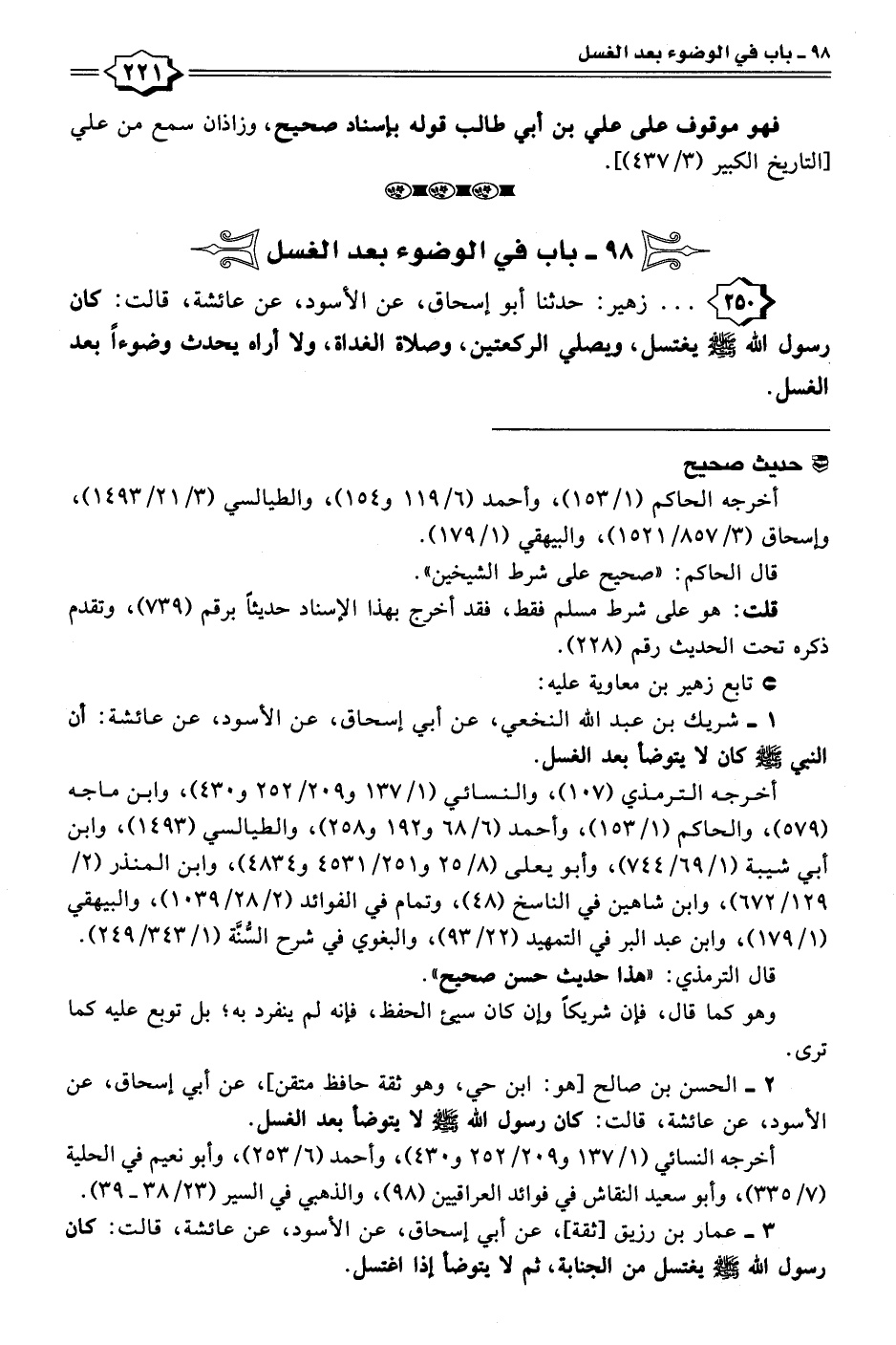 ٢ - الحسن بن صالح [هو: ابن حي، وهو ثقة حافظ متقن]، عن أبي إسحاق، عن الأسود، عن عائشة، قالت: كان رسول الله - صلى الله عليه وسلم - لا يتوضأ بعد الغسل.